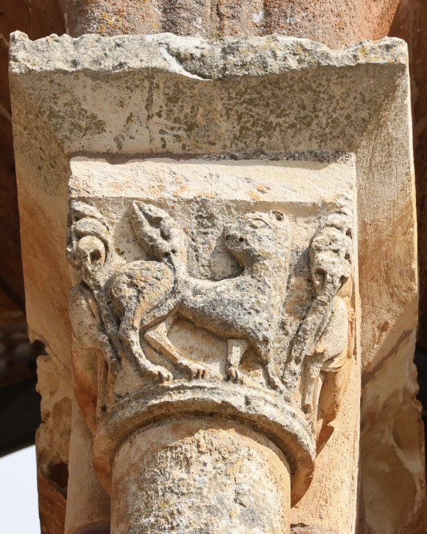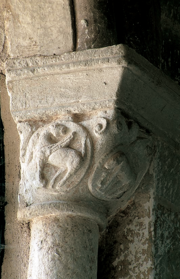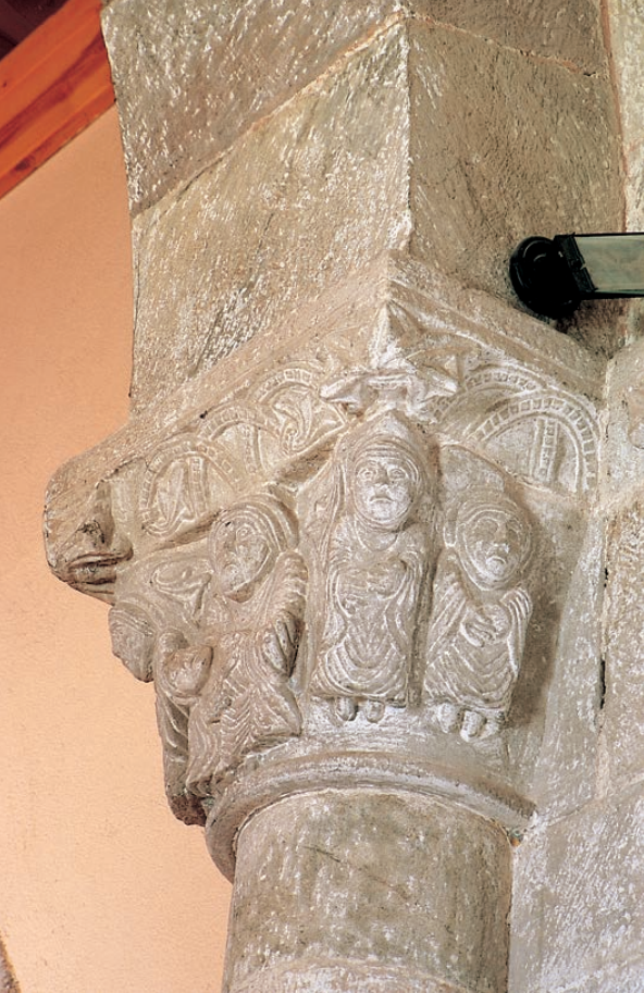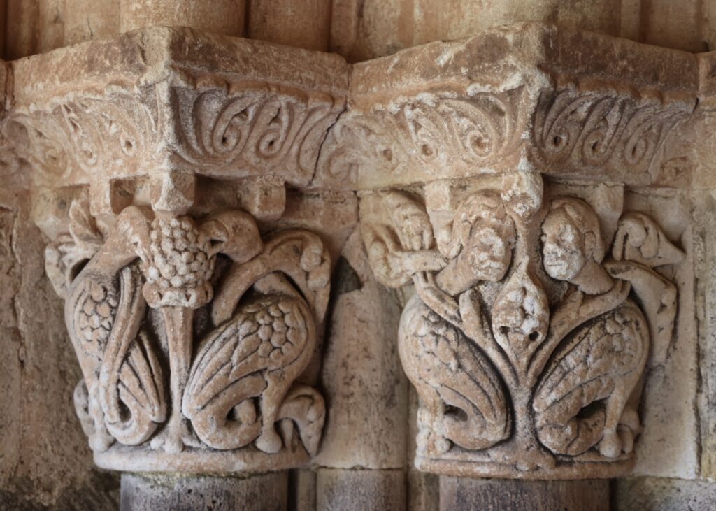 これらの柱頭には様式化された植物、滑らかな葉と突起、人物たちの顔、翼を広げたハルピュイア、向かい合うライオン、「受胎告知」(『ルカによる福音書』1章)、「エジプトへの逃避」(『マタイによる福音書』2章)といったテーマが彫られています。
