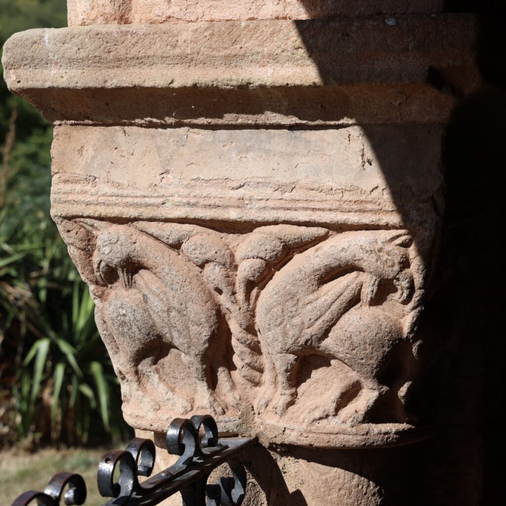 ポルティコの柱頭には、幻想的な生き物などが彫られています。