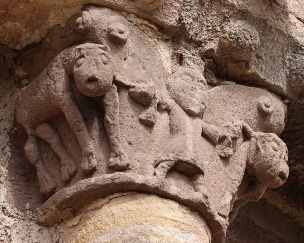 勝利アーチの柱頭と内陣窓の柱頭には、シエラ(Sierra)派による人物像や動物像が彫られているようです。