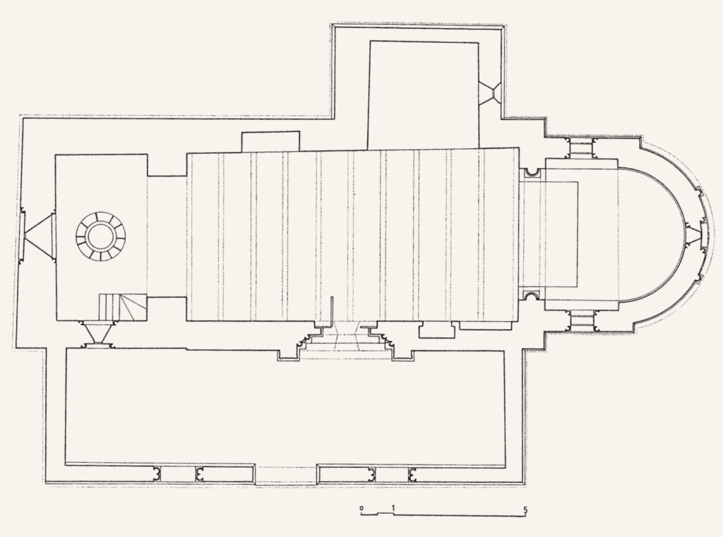 建設は、明確に区別される三つの段階と形態、すなわち身廊、後陣、塔とポルティコで構成されている。