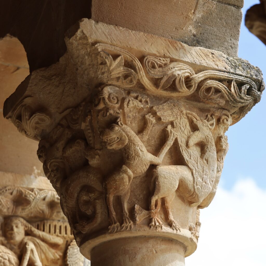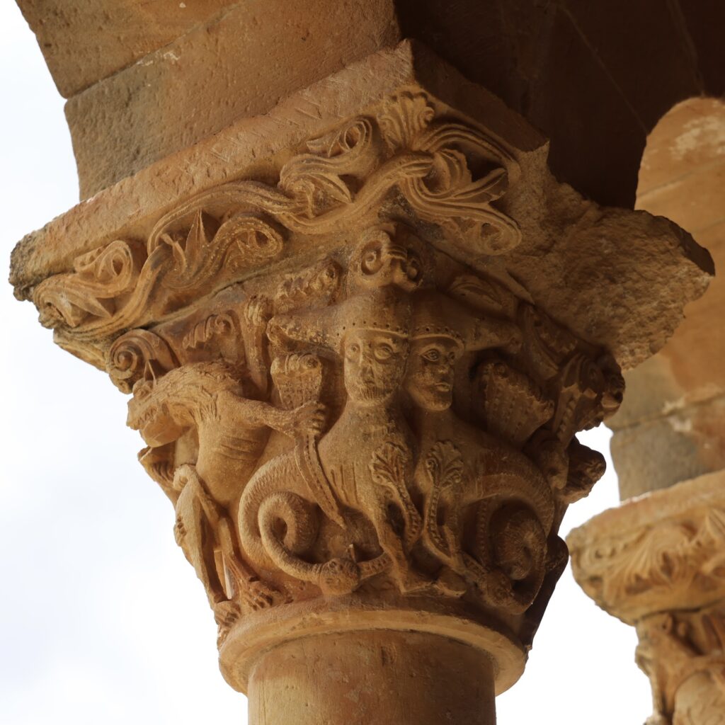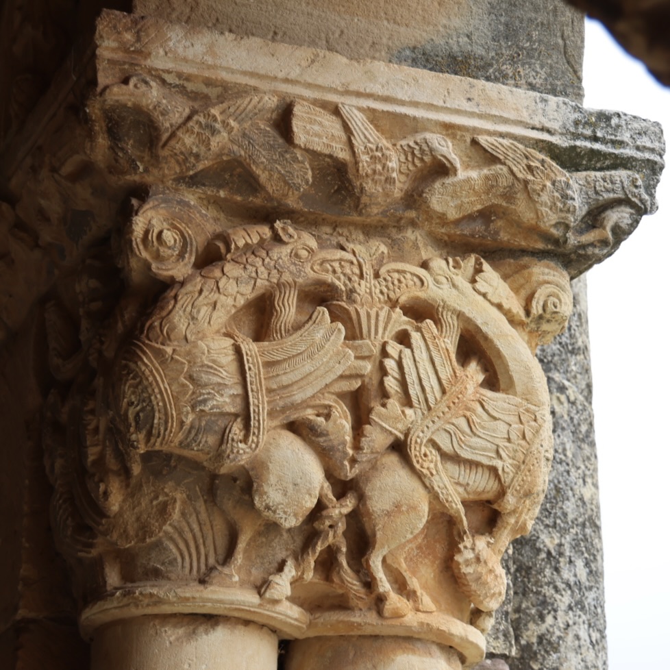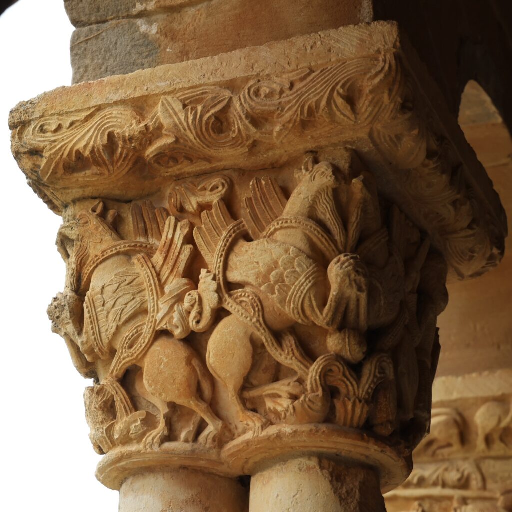柱頭には、幻想的な生き物やライオンなどが彫られています。