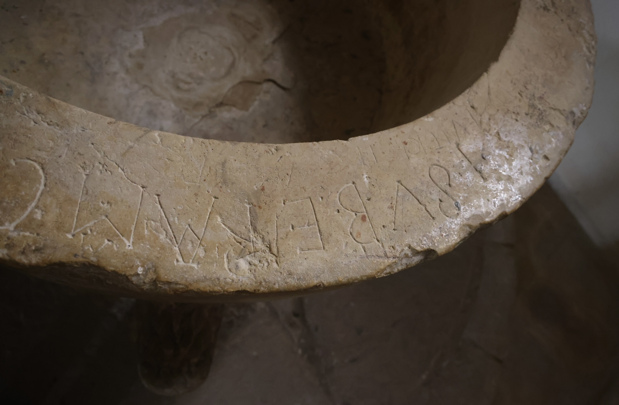 洗礼盤の口部には1195年を示す銘文が刻まれている。その内容は「SUB ERA MCCXXXIII DOMINICVS ABAS EMI(T?)…」である。同じ表面には、非常に判読困難だが中世の文字で書かれた別の銘文「ERA … MCCC FVIT …C…」も存在する。この銘文が何を指すかは不明だが、1262年を示す日付を与えている。