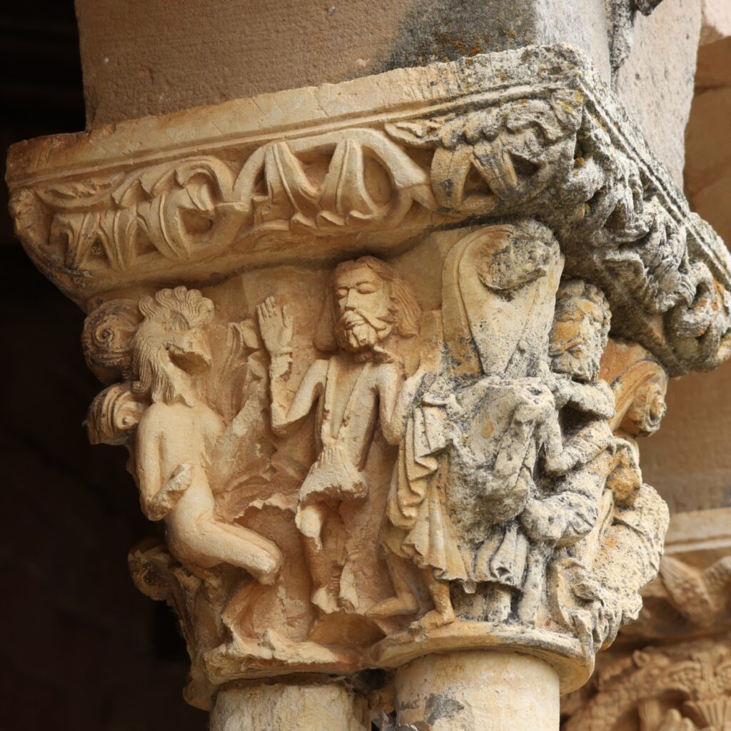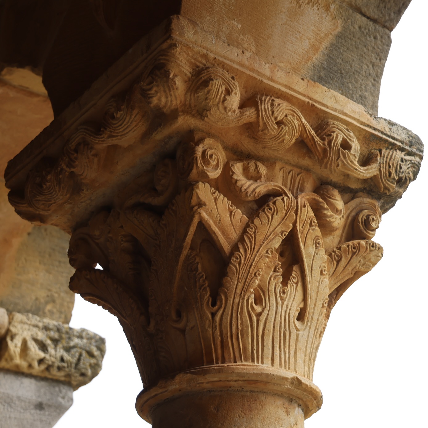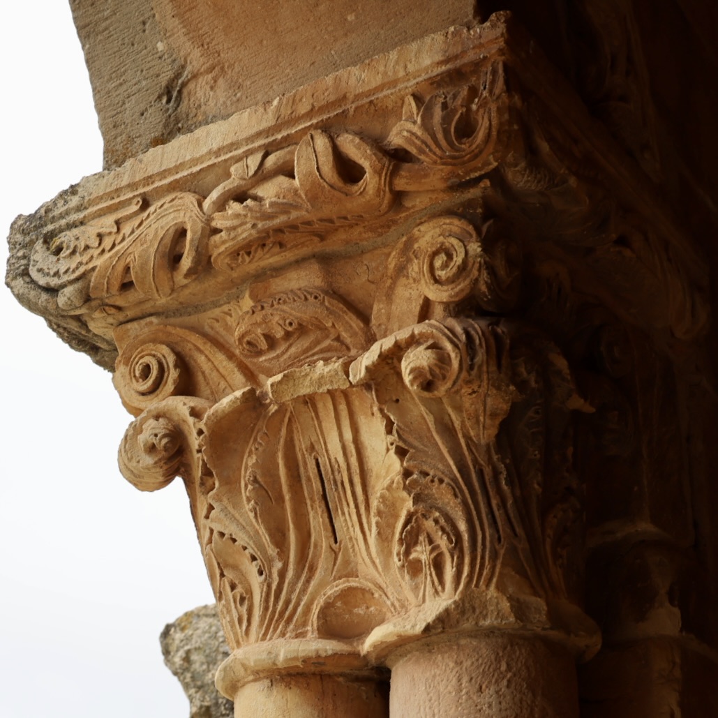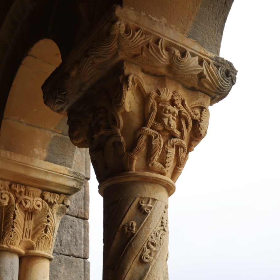 柱頭8は、怪物のような顔と植物が彫られています。柱頭の下には、溝に細かな装飾が刻まれた柱があります。