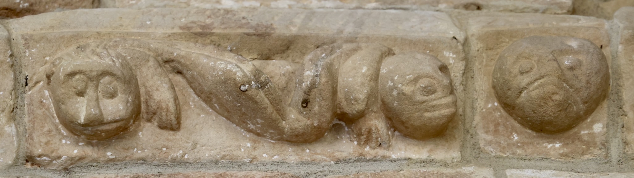 開口部に双子の多葉アーチがあり、アーチの上には「アダムとエバ」(『創世記』3章)が彫られています。