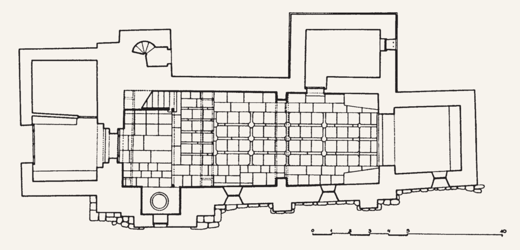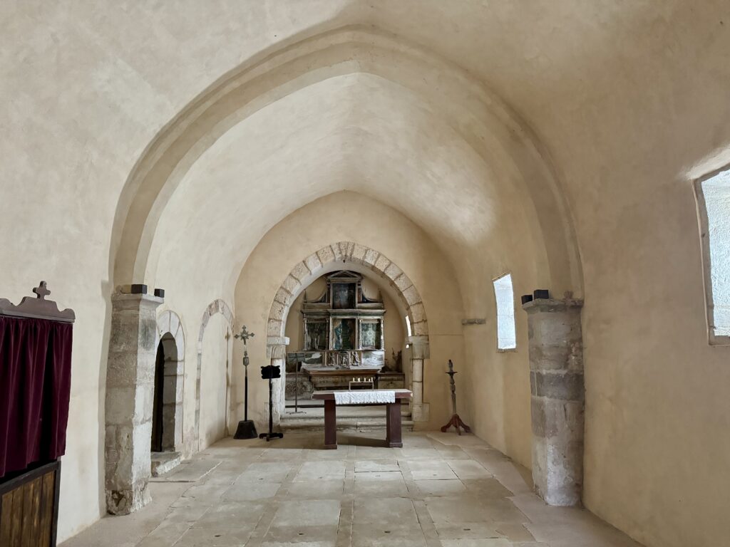 後期ロマネスク様式の原構造は保存されており、四角形の後陣は身廊より低い位置に尖った樽型アーチで覆われている。