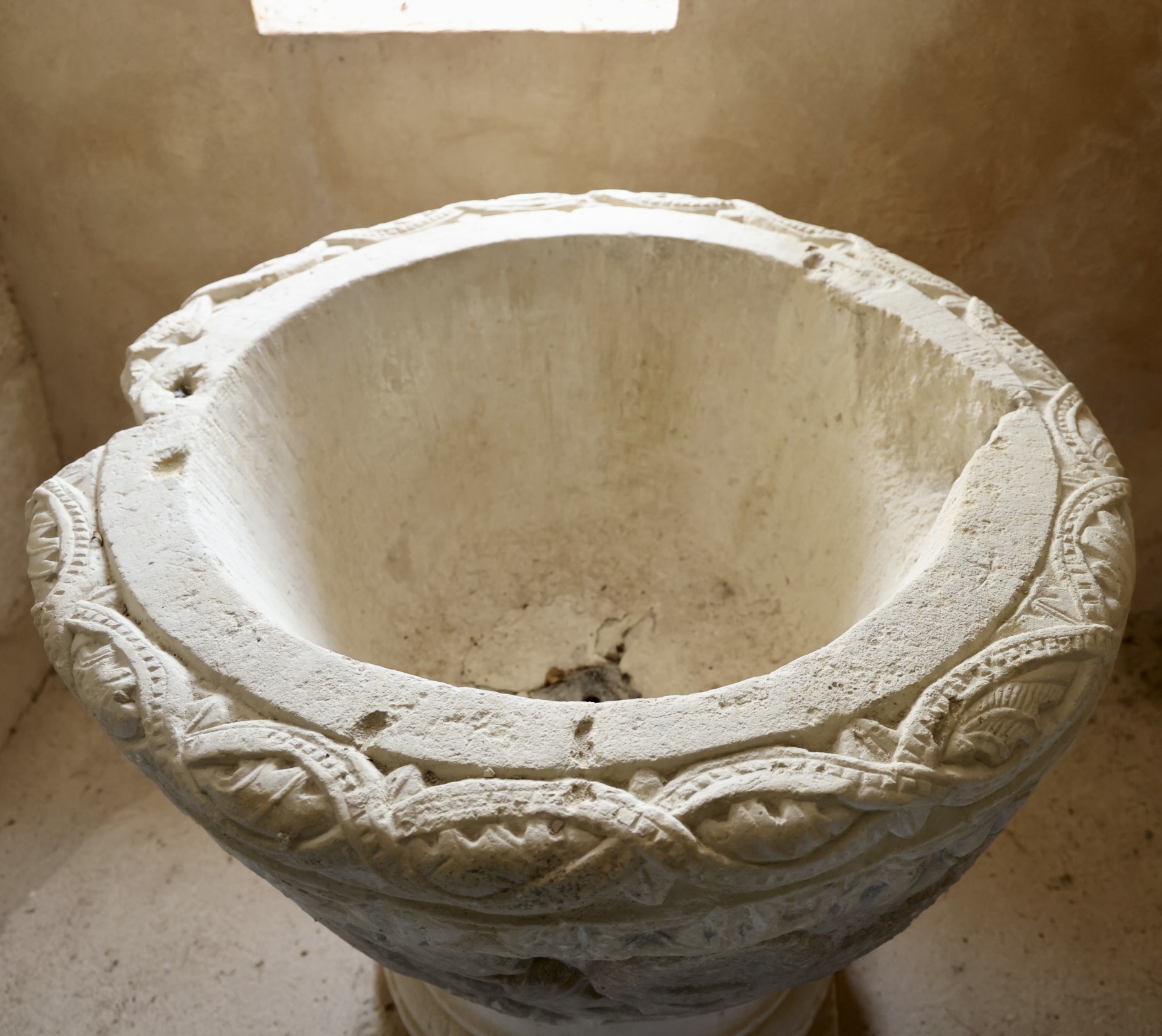 左(東)の一部が損傷しています。教会の鍵を開けてくれた男性によると、これは洗礼盤を移動しようとしたときについた傷です。