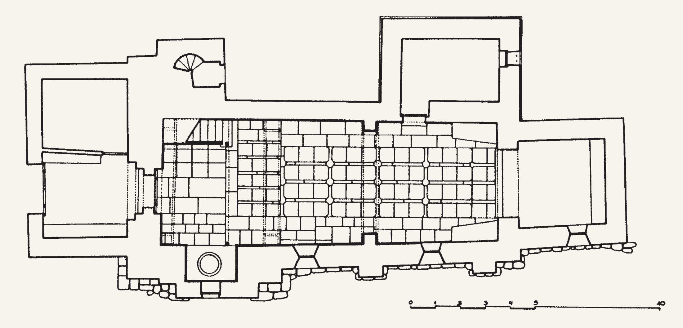 後期ロマネスク様式の原構造は保存されており、四角形の後陣は身廊より低い位置に尖った樽型アーチで覆われている。