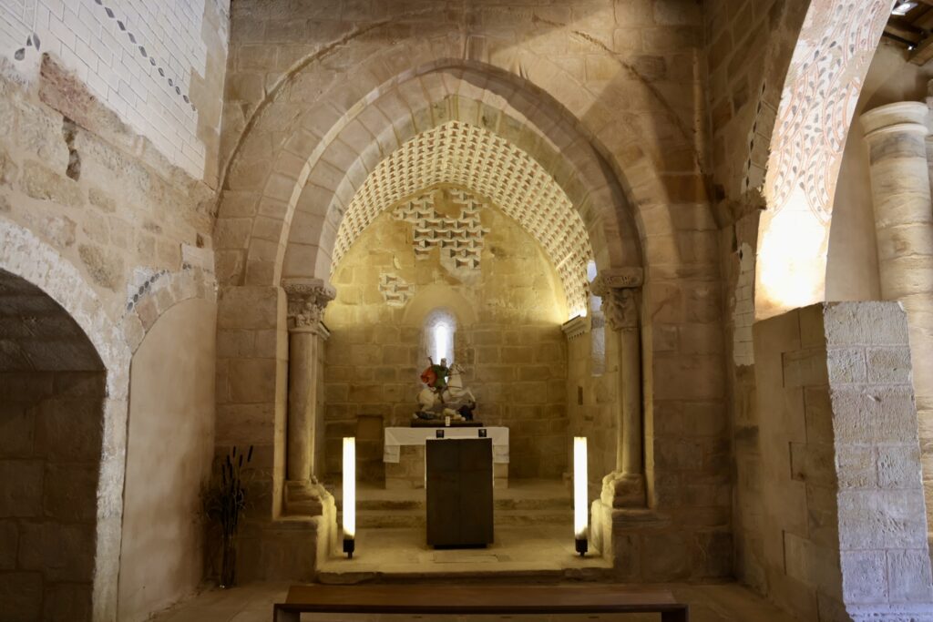 後陣の内観は、勝利アーチ左側の柱頭に2人の騎士の戦いが描かれ、それを女性(教会の世俗への仲介を象徴)が制止している。
