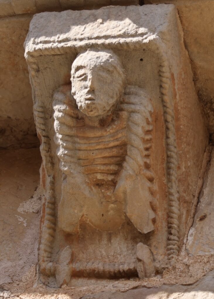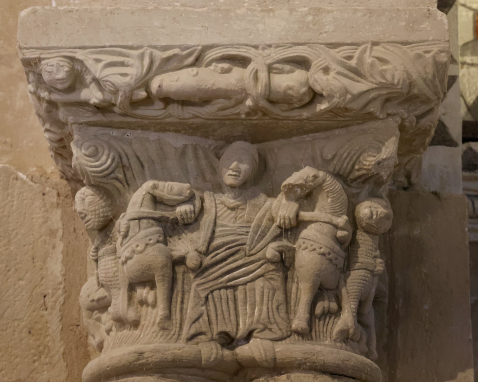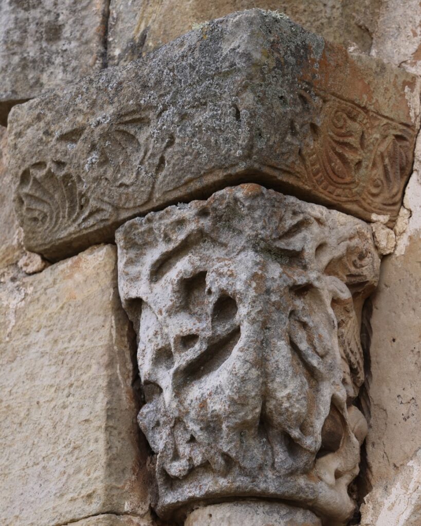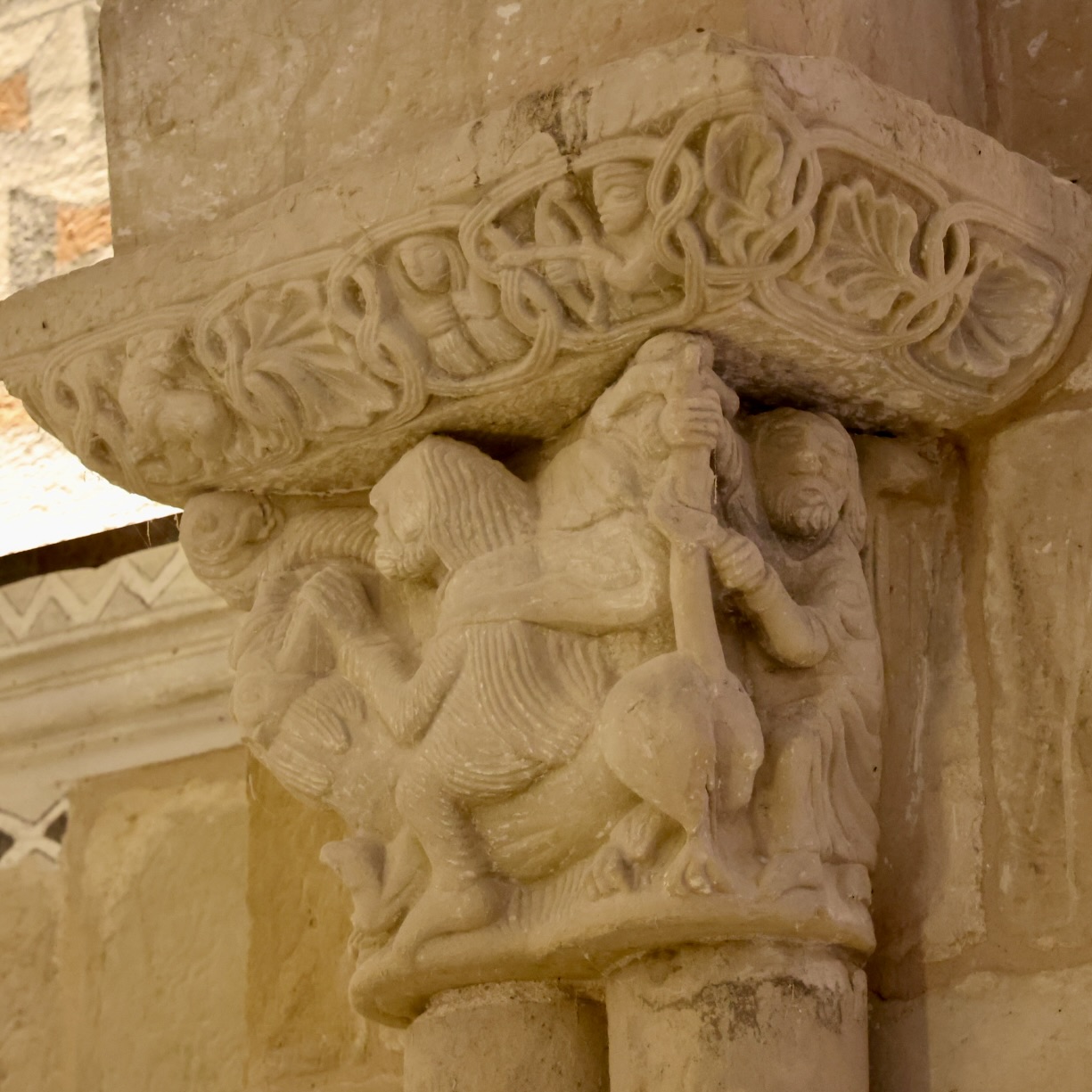 左(南)側の柱頭は、向かい合う幻想的な生き物だと思います。右(北)側の柱頭は、「獅子の穴の中のダニエル」(旧約聖書『ダニエル書』6章)かもしれません。