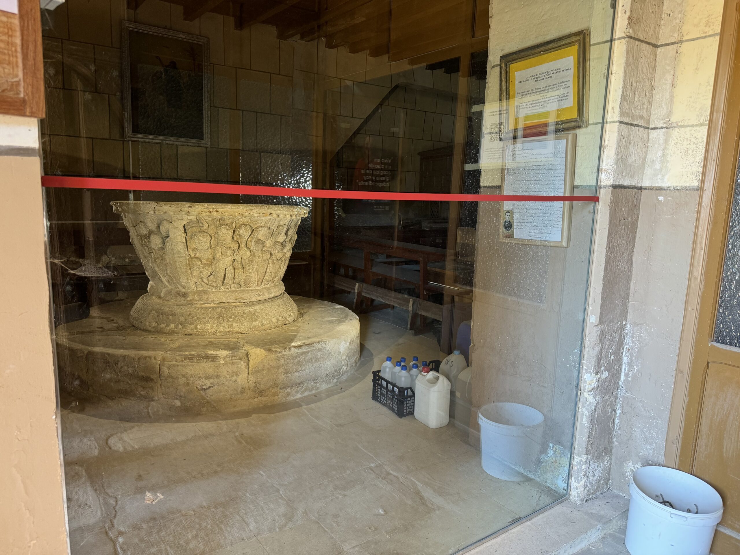 私は、修復工事をしていた女性たちと話しました。洗礼盤に近づくことはできず、ガラス越しのこの角度だけ、見学を許されました。