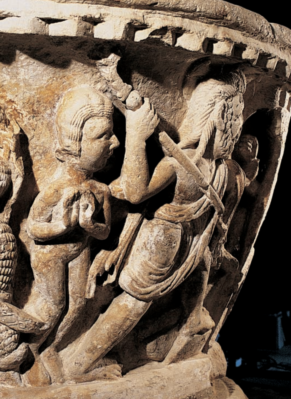 たぶん、眠る番兵たちのとなりには、「イエスの復活」(『マタイによる福音書』28章、『マルコによる福音書』16章、『ルカによる福音書』24章、『ヨハネによる福音書』20章)にまつわる場面(3人のマリアと天使)が彫られていると思います。