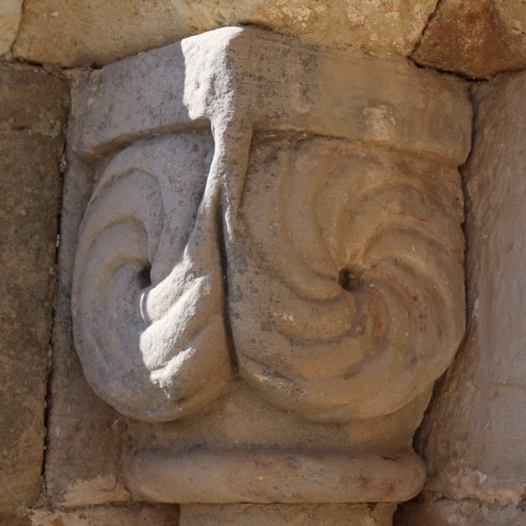 Iglesia de San Cosme y San Damián。南扉口に柱頭彫刻があります。