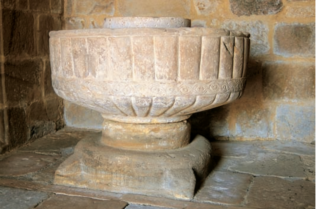 直径115cm、高さ48cmの盃から成るロマネスク様式の洗礼盤があり、高さの中程に縁取りが施されている。円形の台座は、角にツメが付けられている。類型学的にも装飾的にも、バリオ・パニサレス(Barrio Panizares)、アルセラーレス・デル・トゾ(Arcellares del Tozo)、ペドロサ・デ・バルデルシオ(Pedrosa de Valdelucio)の洗礼盤と直接的に関連しており、おそらくペドロサ・デ・バルデルシオ(Pedrosa de Valdelucio)と同じ作者によるものであろう。