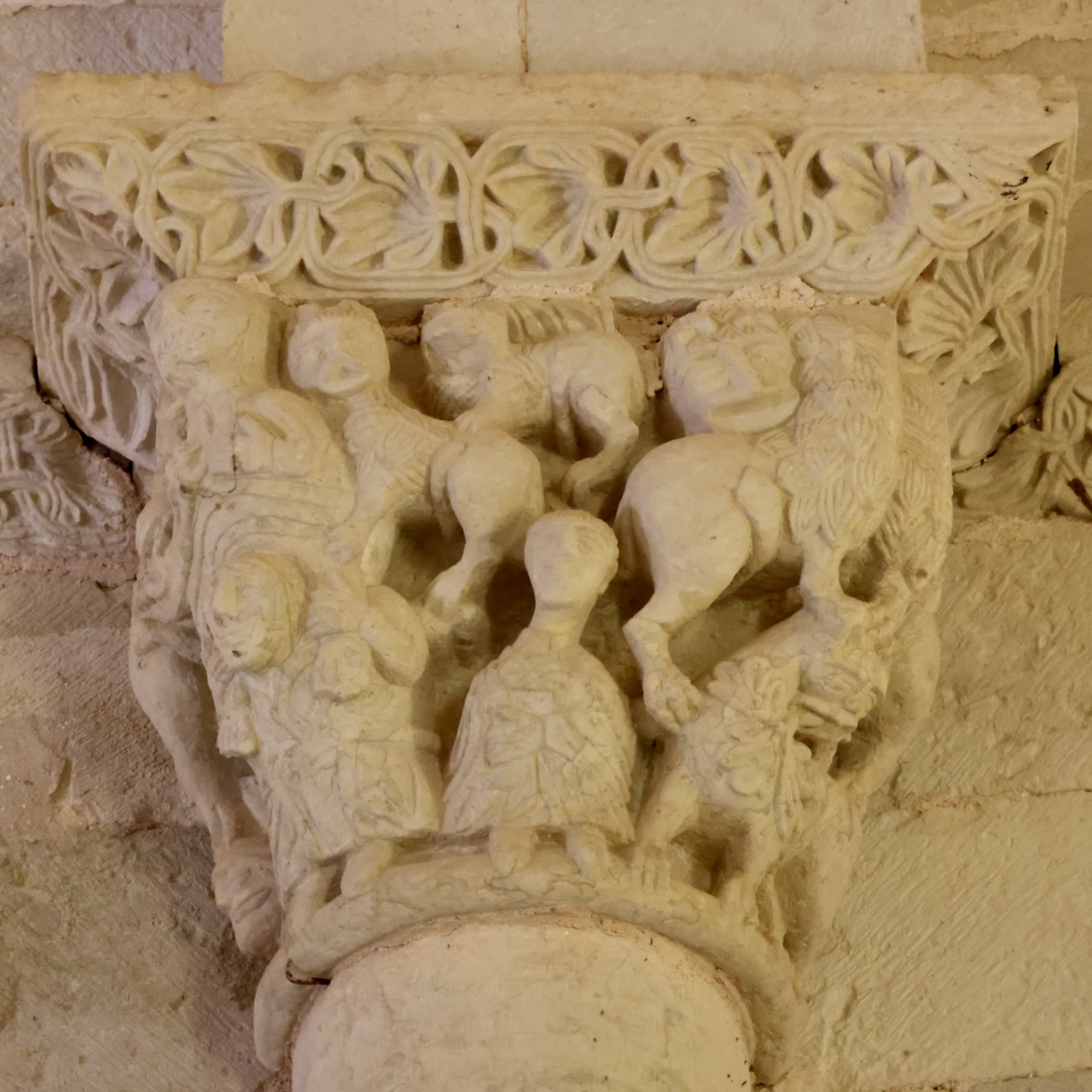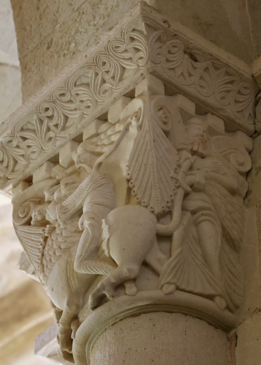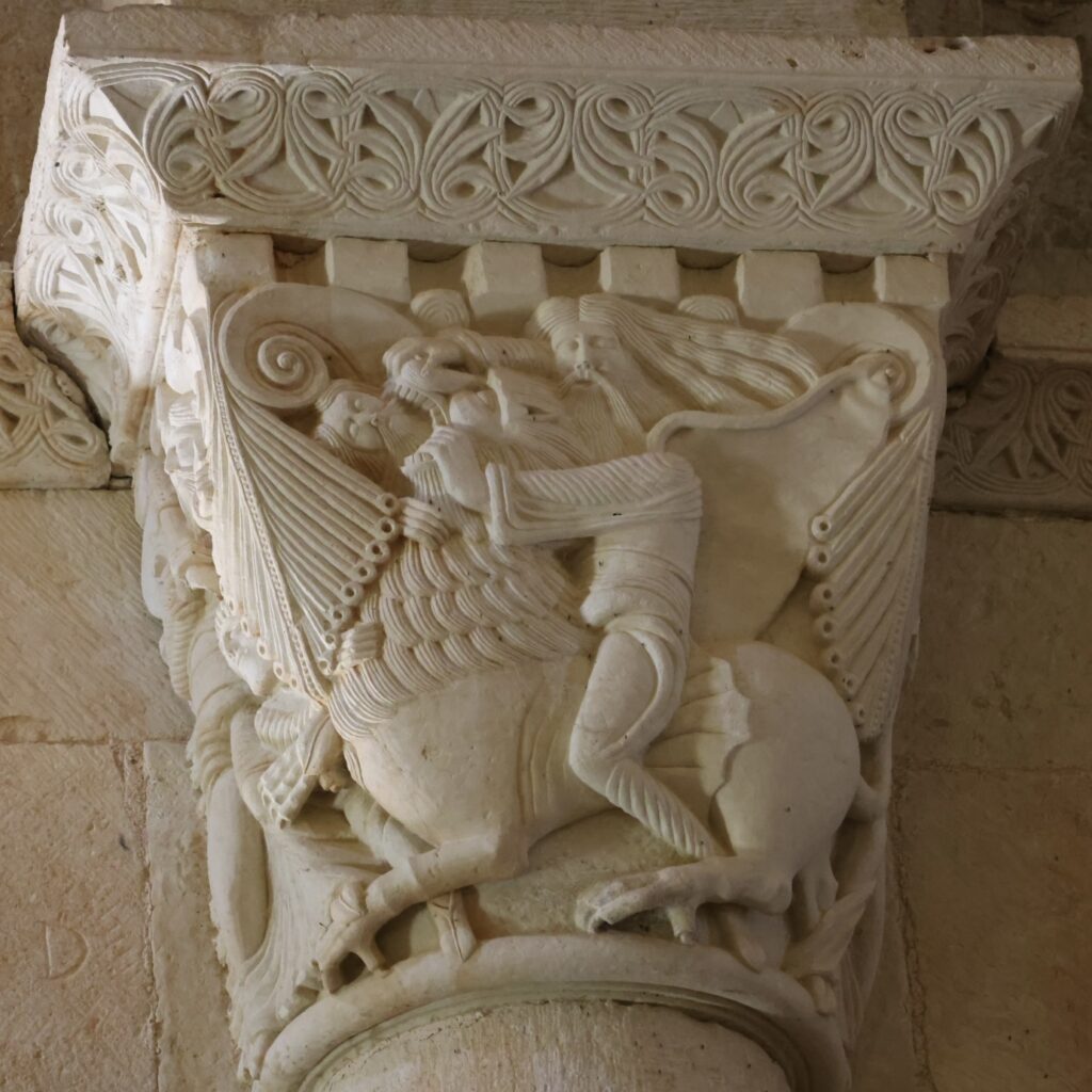 ロマネスク建築の第2段階の彫刻は、ラピダリウムにも残されています。失われた回廊にあった柱頭です。