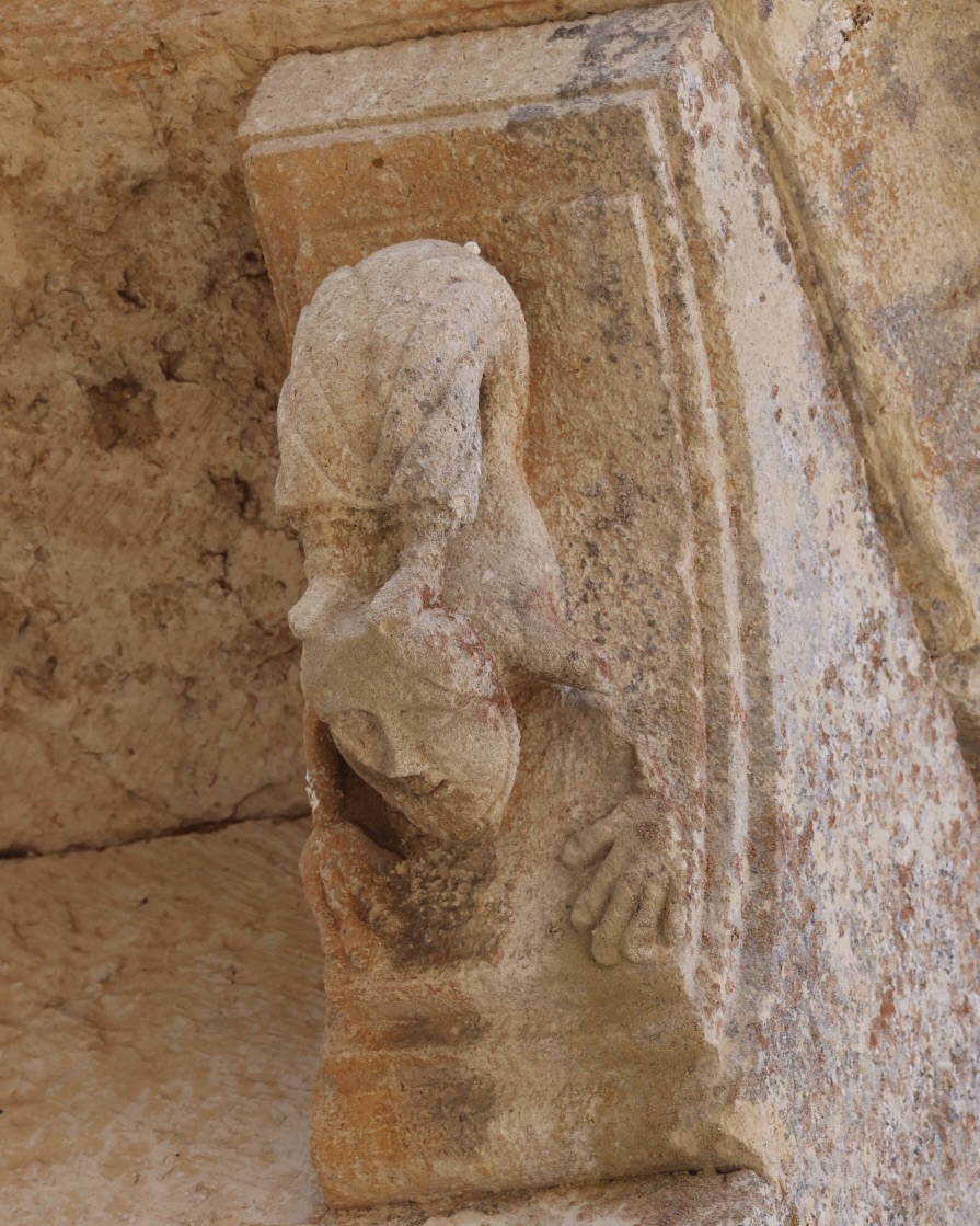 獅子の頭の先には、棍棒のようなものを持った男性がいます。モアルベス(Moarves)、サンタ・エウフェミア・デ・コスエロス(Santa Eufemia de Cozuelos)、レボジェド・デ・ラ・トレ(Rebolledo de la Torre)、セスラ(Cezura)、バスコンシジョス・デル・トソ(Basconcillos del Tozo)などに見られる図像です。