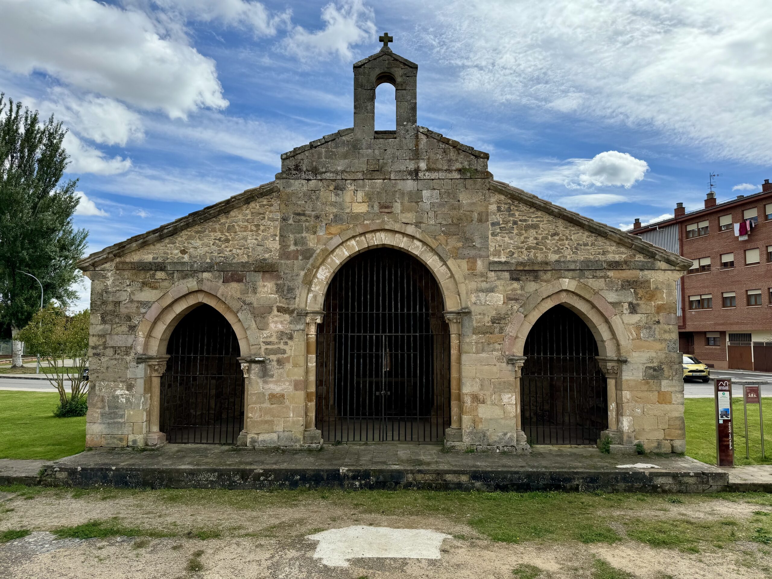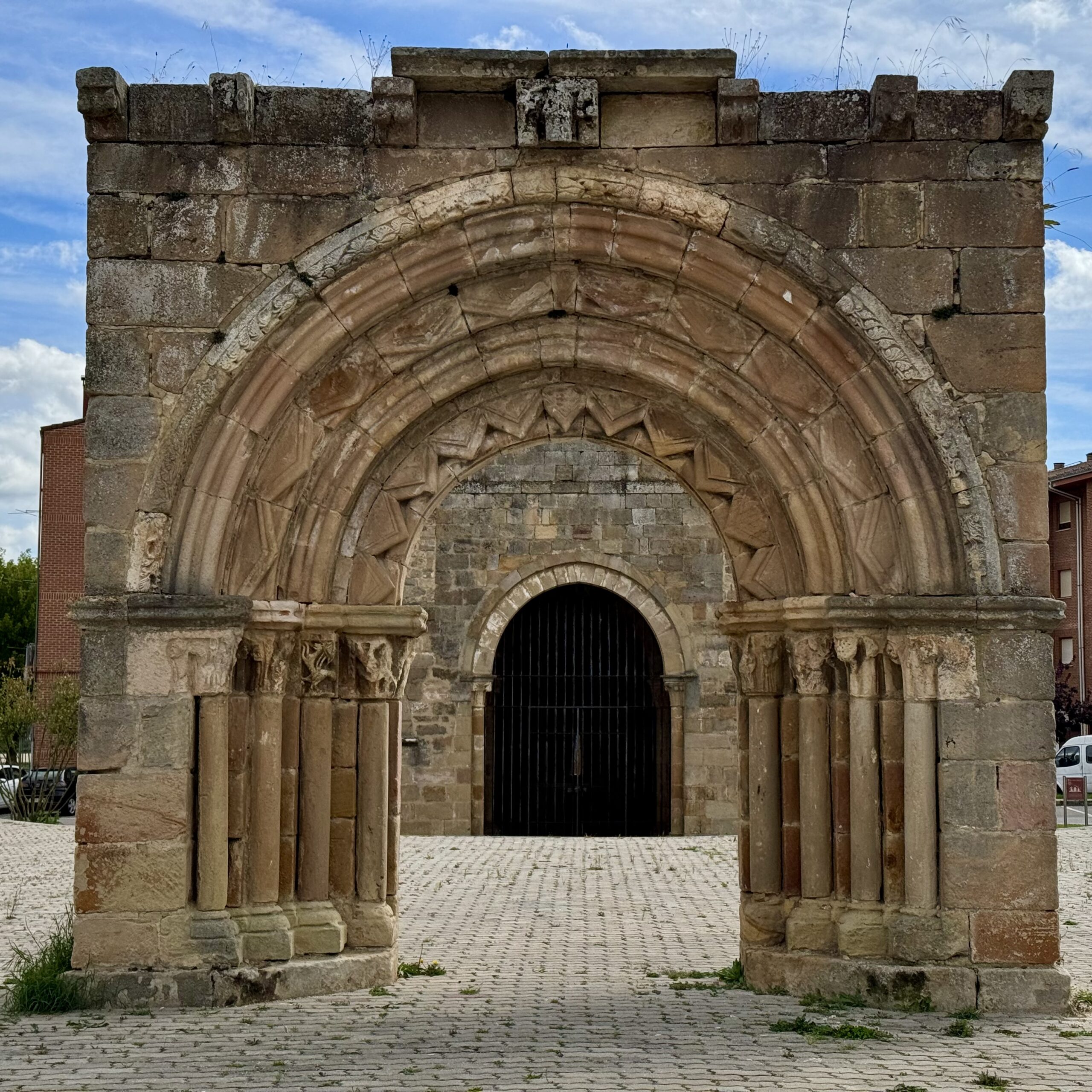 原始的な教会で残っているのは、ロマネスク様式の要素、つまり、その扉口と後陣だけである。彫刻的装飾は、扉口と柱頭に集中しており、サン・アンドレス・デ・アロヨ修道院(monasterio de San Andrés de Arroyo)との明確な関連性を示している。ズーモルフィックな人物像や擬人化された人物像もある。扉口には、ノコギリの歯、ジグザグのモチーフ、植物の装飾で飾られた四つのアーキヴォルトがある。