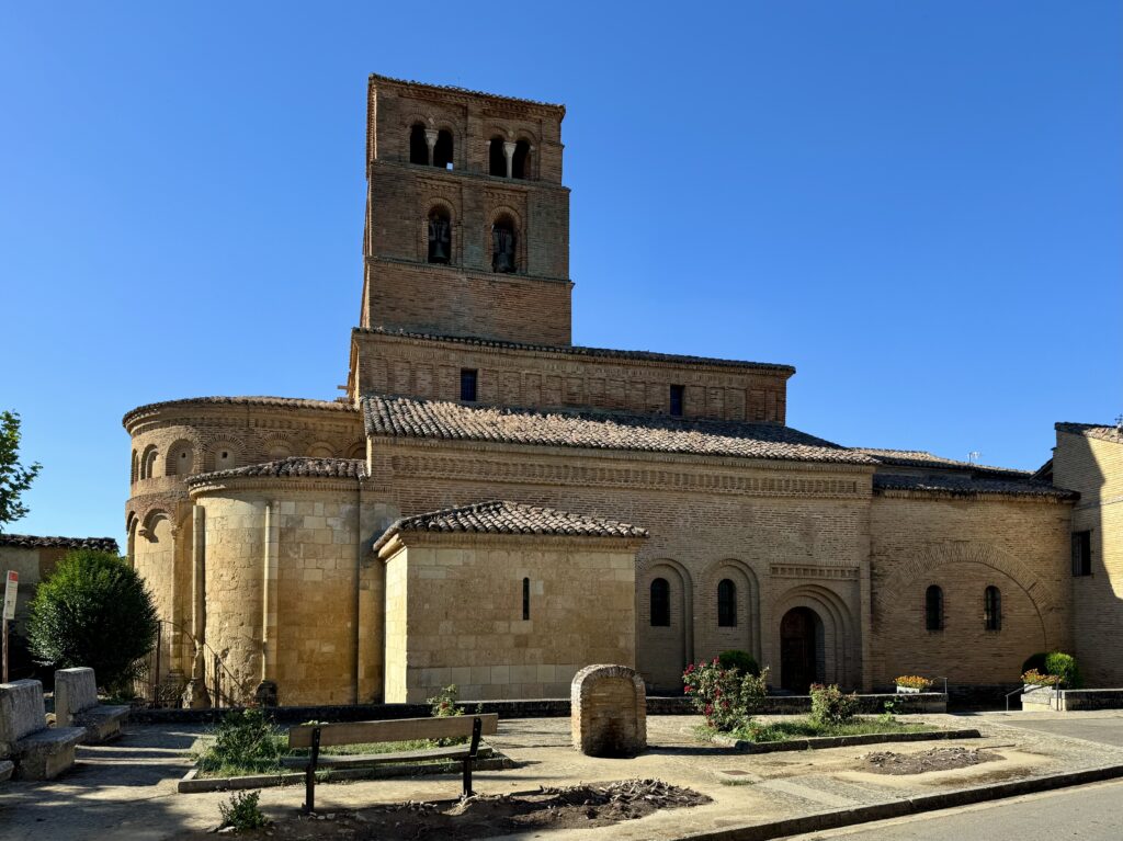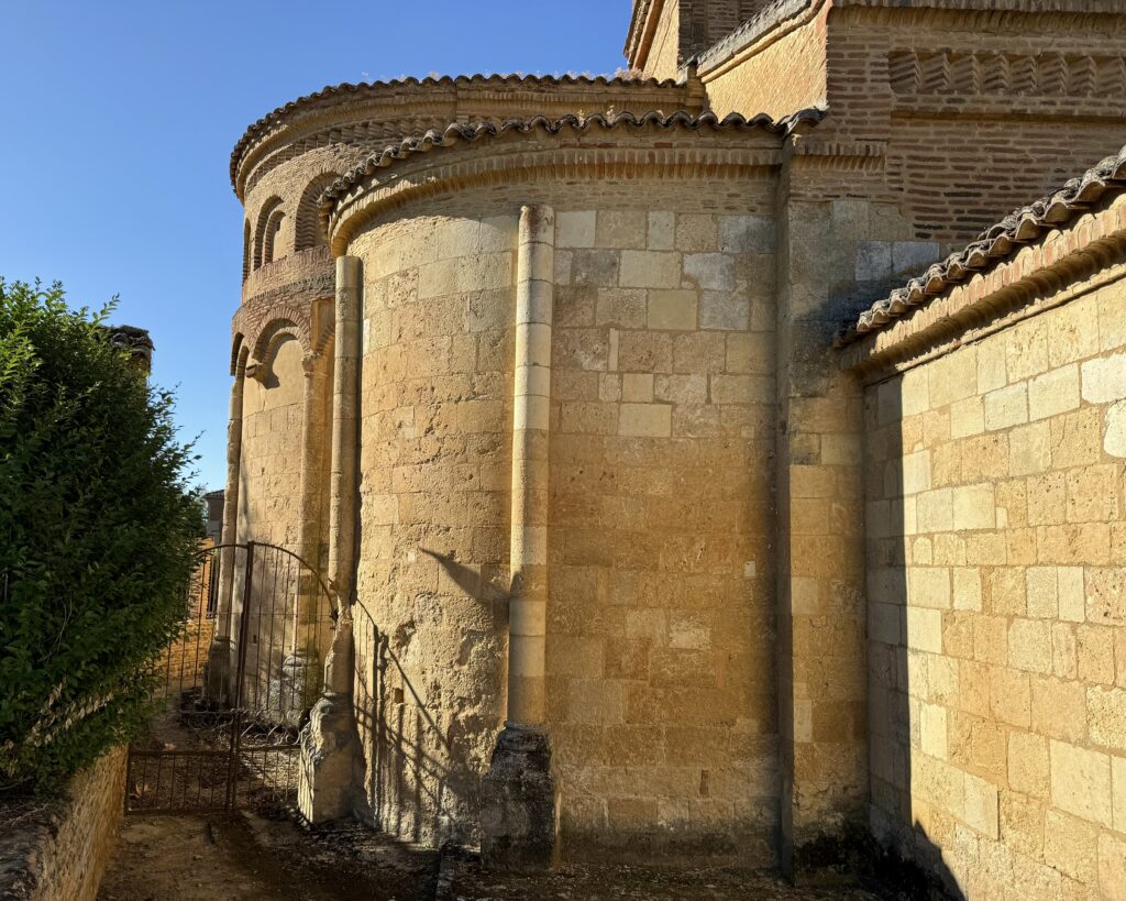 石や煉瓦といった異なる材料が使われていることから容易に推測できるように、今日私たちが目にする教会は、様々な建設段階の結果である。石組みは、ロマネスク様式を明確に区別しており、それは後陣から始まったに違いない。サン・ティルソ・デ・サアグン(San Tirso de Sahagún)のように、石づくりで始まり、煉瓦で仕上げられた。しかし、後述するように、これは未完成のプロジェクトの完成というよりも、改修の結果と考えるべきであろう。