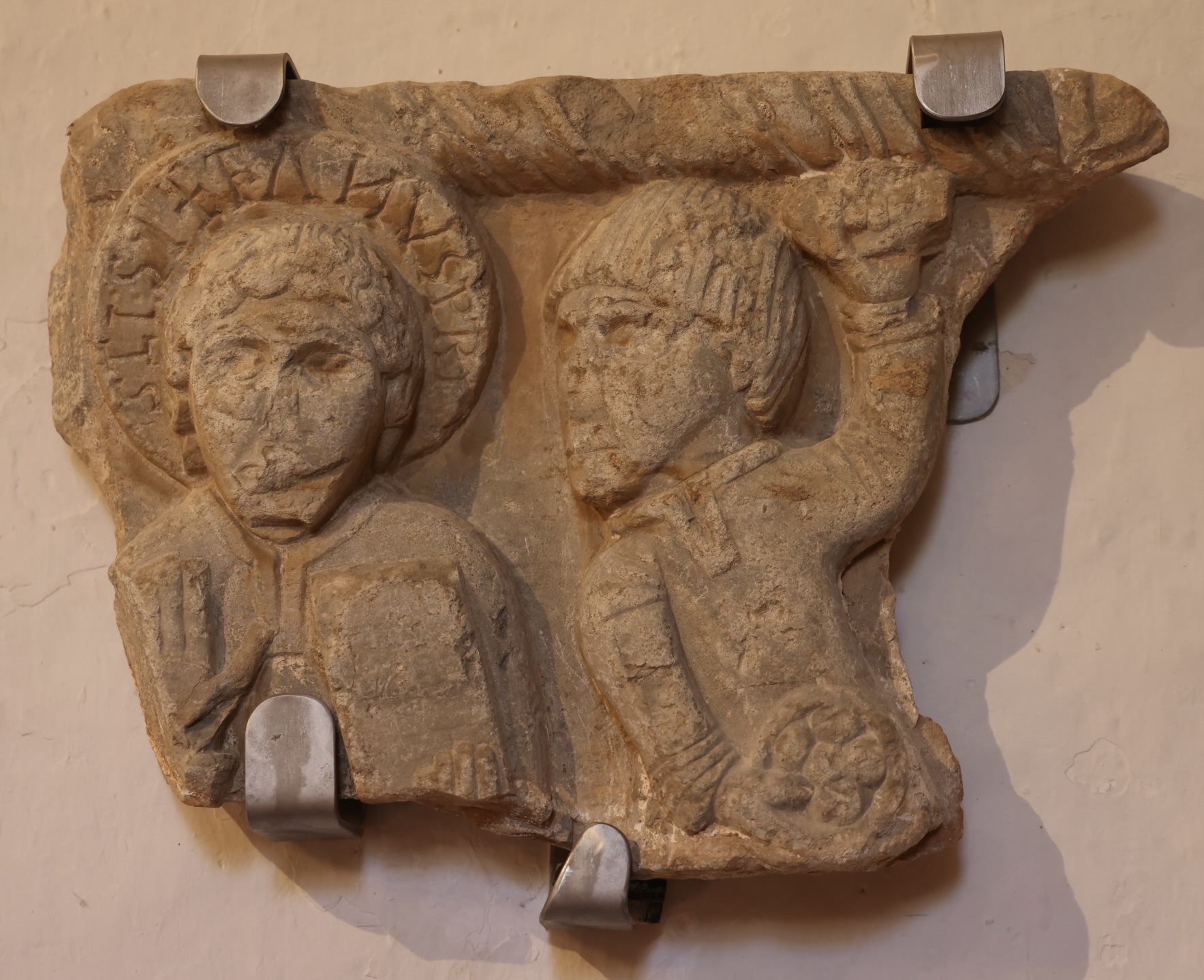 左の聖人のニンブスに「SCI STEFANVS PRI」と刻まれていて、右の人物は両手に石のようなものを持っています。
