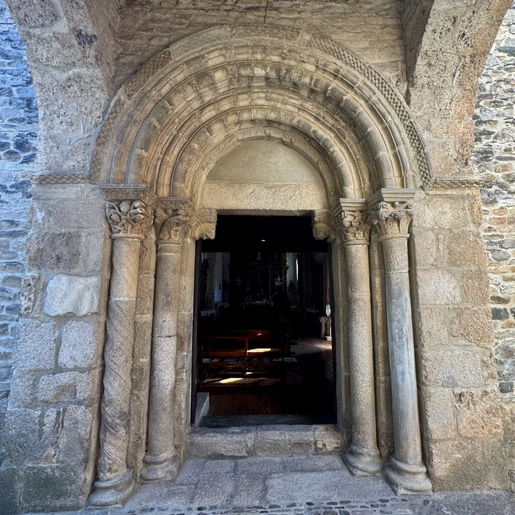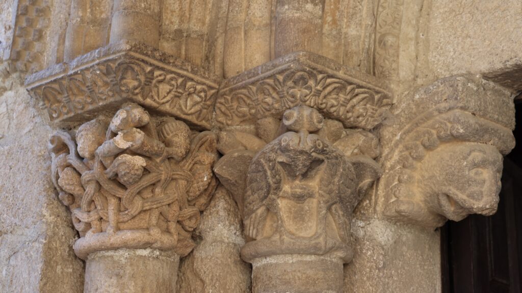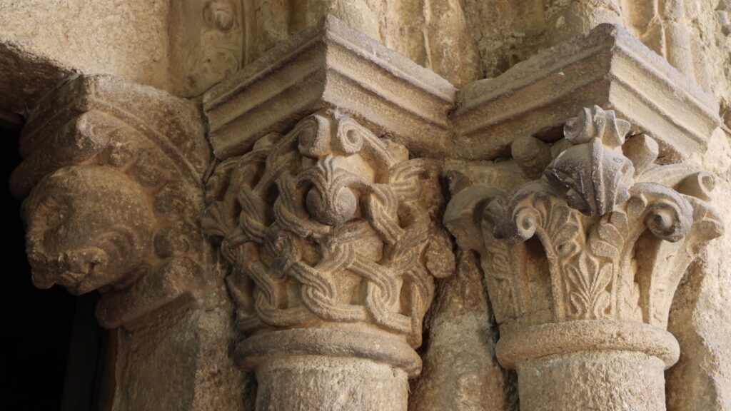 興味深いのは、外側の柱の軸で、左側はコンポステーラ風の植物装飾が絡み合っており、右側は部分的に大理石で、扉口を構成する美しいピンク色の花崗岩とは対照的であり、再利用の可能性を示唆している。これらの柱が冠する柱頭も花崗岩で作られている。