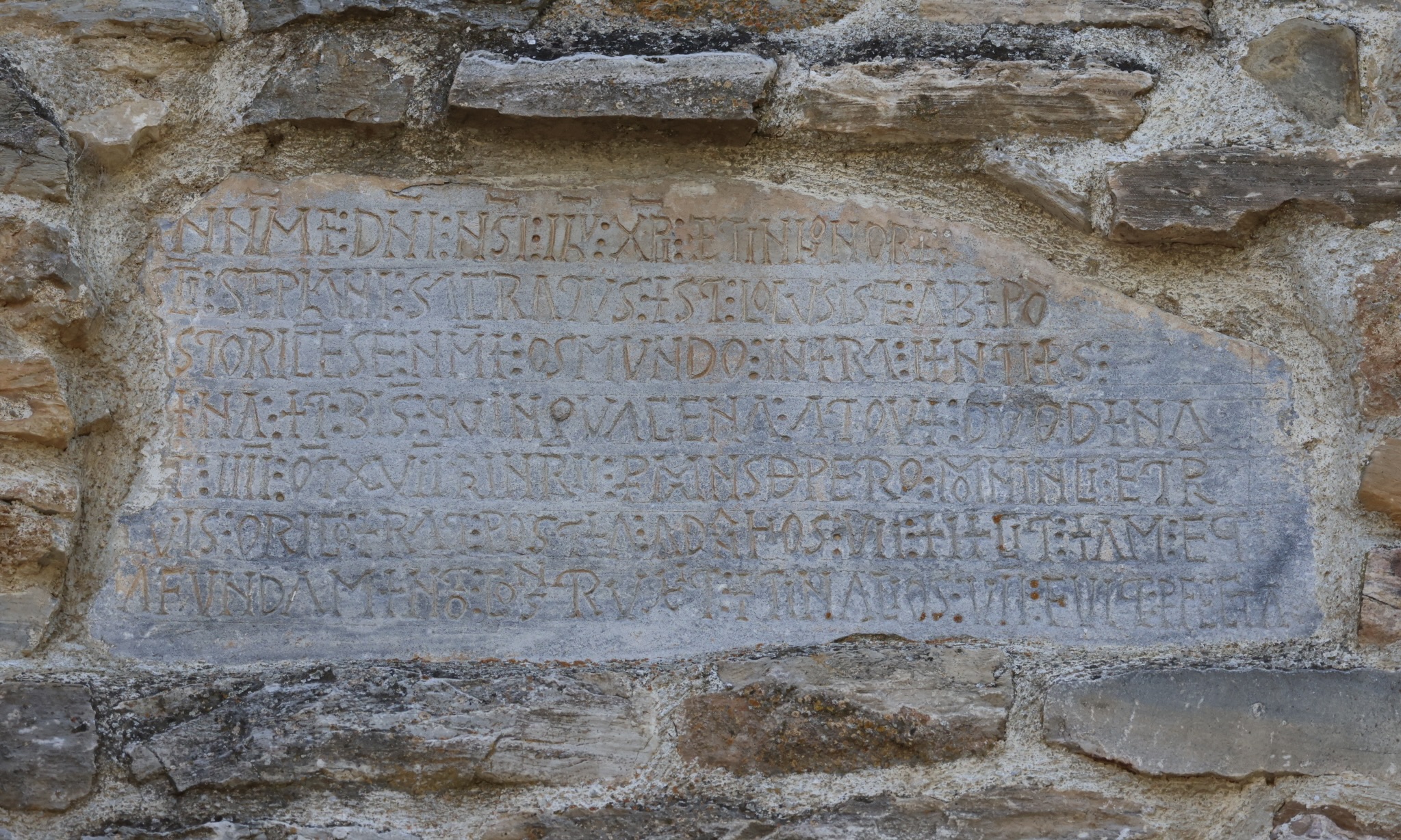 IN NOMINE DOMINI NOSTRI IESU CHRISTI ET IN HONORE(m) SANCTI STEPHANI SACRATUS EST LOCUS ISTE AB EPISCOPO ASTORICENSE NOMINE OSMUNDO IN ERA CENTIES DE[ce]NA ET BIS QUINQUAGENA ATQUE DUODENA ET IIII QUOTUM XVII KALENDAS IANUARII PER MANUS DE PETRO MONINCI ET PRESBITER CUIUS ORICO ERAT. POSTEA AD ANNOS VII EIECIT EAM ET A FUNDAMENTO CONSTRUXIT ET IN ALIOS VII FUIT PERFECTA.