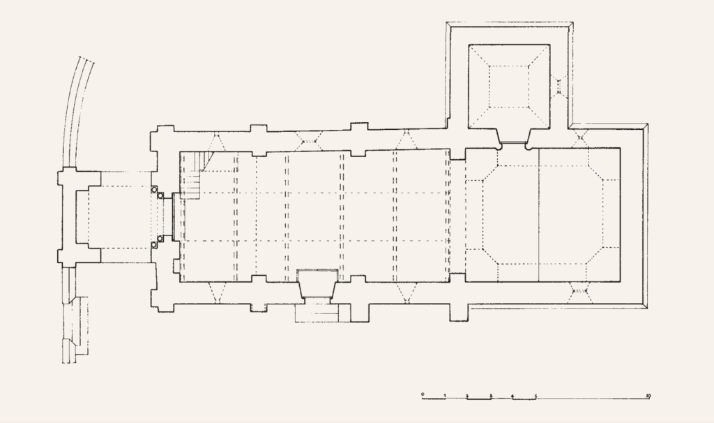 身廊の西側に、ポーチ鐘楼がある。その上部は19世紀前半の建築だが、構造の大部分は現存している。