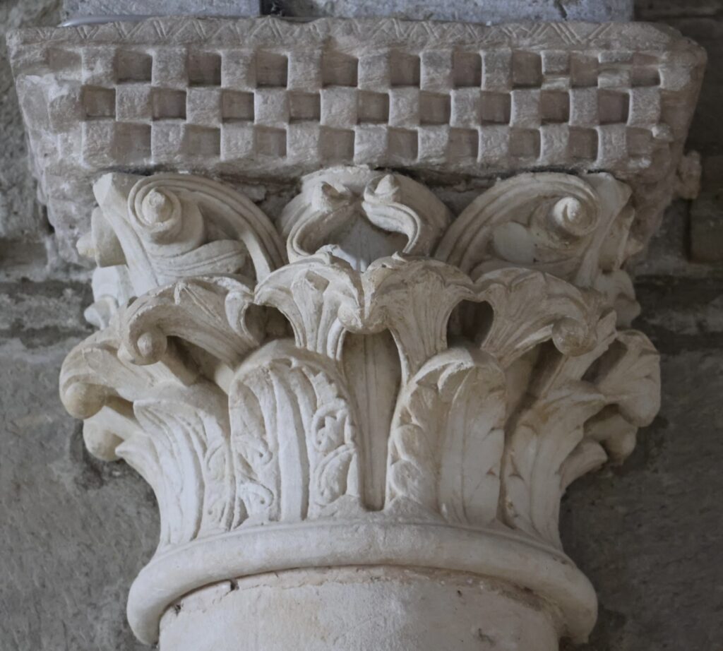 春分の光が照らす柱頭は、この教会で最も興味深いもののひとつである。