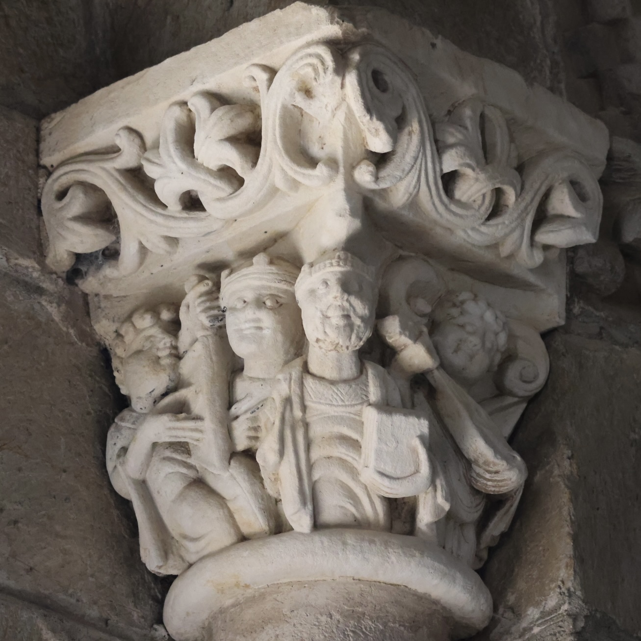 もうひとつの柱頭は、ダビデ王を表しているようです。中央の男性は、左手に書物を持ち、王冠を戴く隣の男性(サウル王?)から指をさされています。両者の両脇には、2人の音楽家がいます。