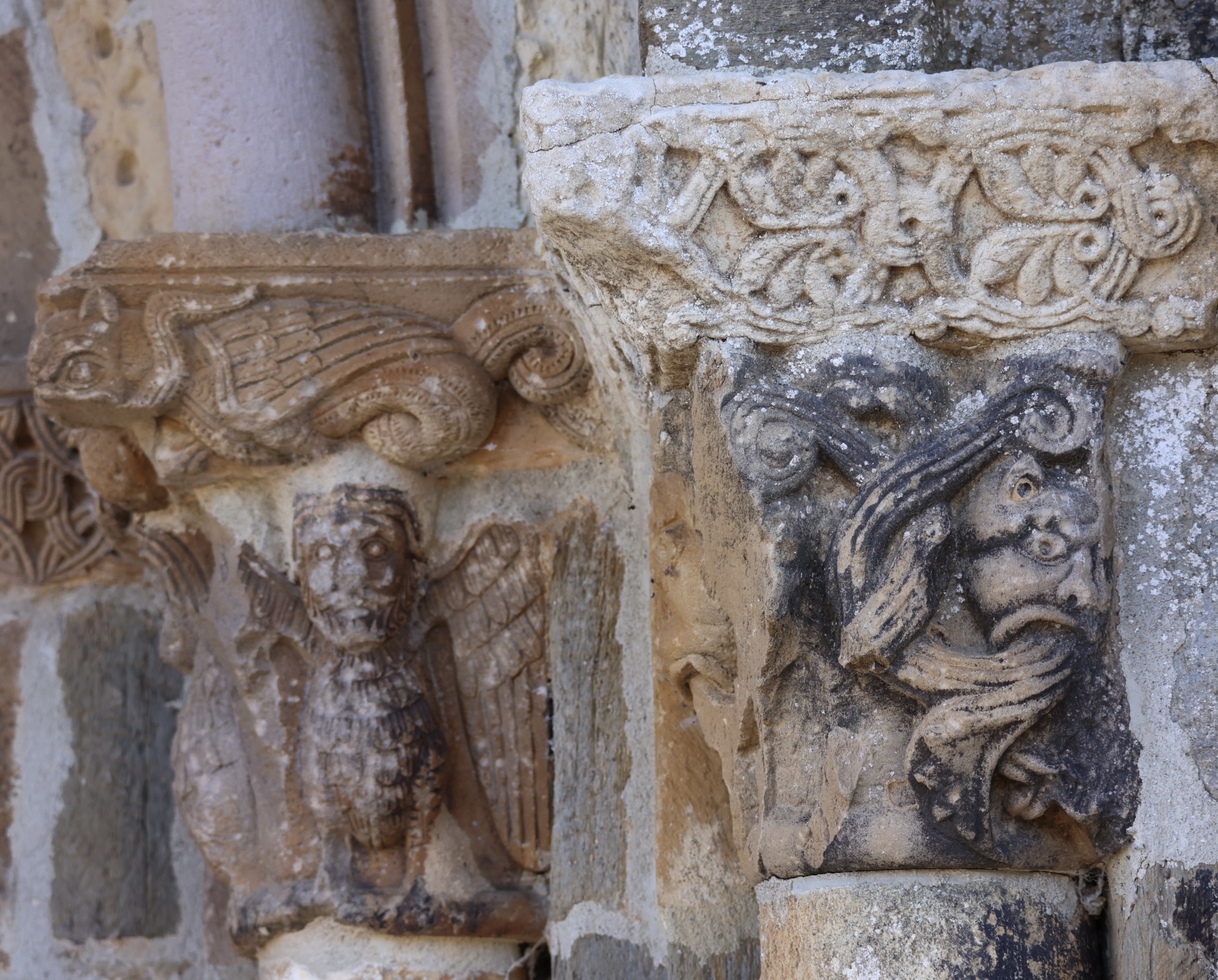 柱頭には、幻想的な生き物たちが彫られています。