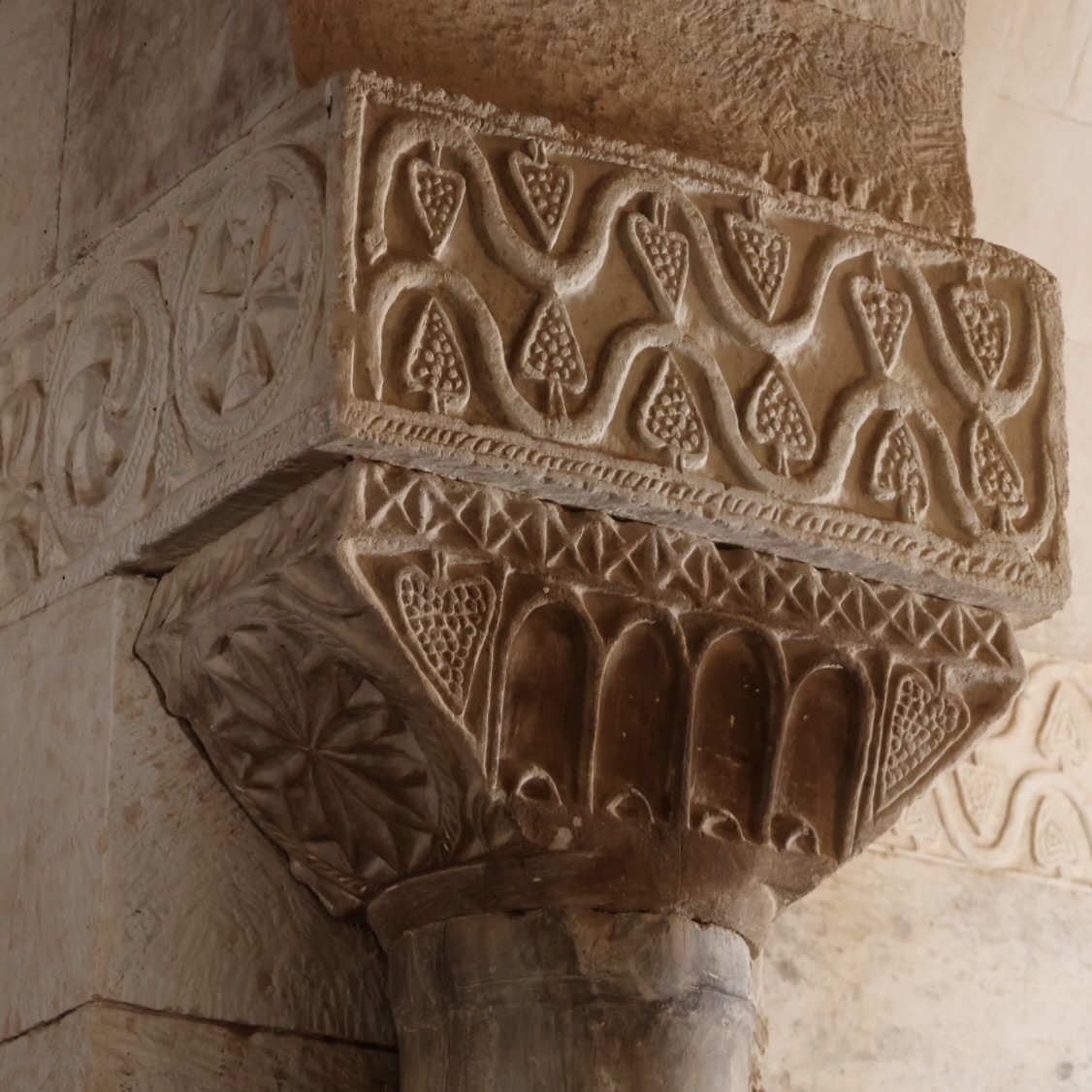 柱頭は、幾何学模様や植物モチーフです。