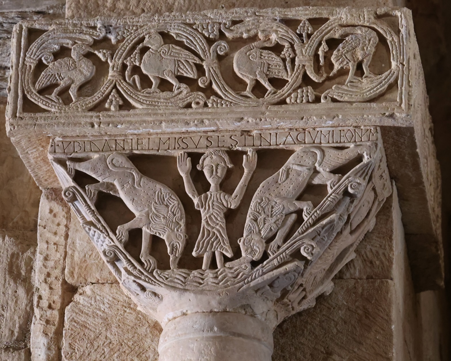 「獅子の穴の中のダニエル」を描いた柱頭では、聖書の人物が場面の中心に据えられ、預言者の足元で大人しく水を飲む一対の獅子が周囲を囲む。その上には「ダニエルが獅子の穴に投げ込まれた場所(UBI DANIEL MISSUS EST IN LAQUM LEONUM)」との碑文がある。彫刻家が「laqum(穴)」という語を「lago(湖)」と混同したため、ダニエルの足元に水があると考えられている。しかし、この場面に誤りはないとする見解もあり、むしろ「lacus(湖)」という語が洗礼を意味する点に意図的な言葉遊びを見いだす者もいる。