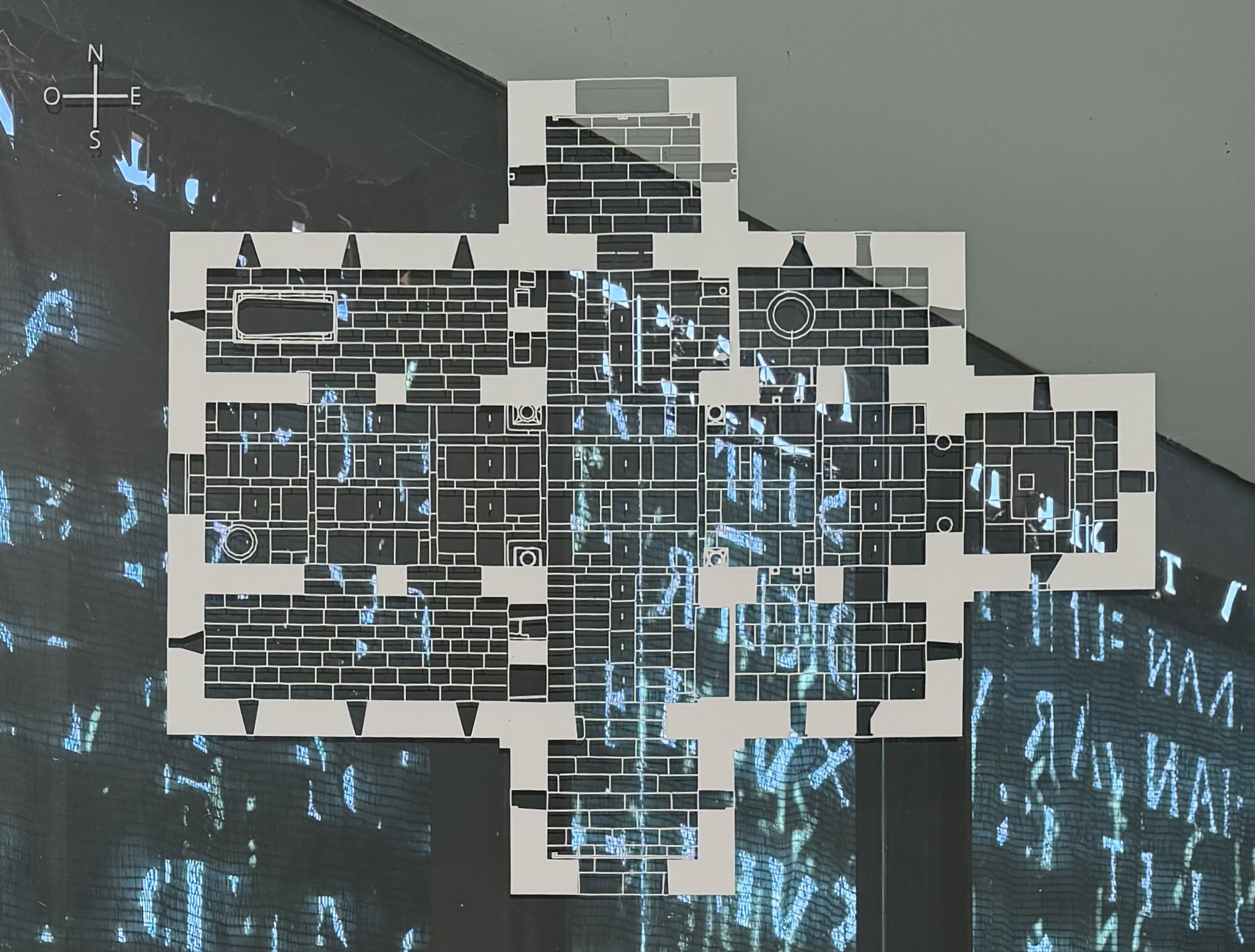 教会の隣の展示室にあった案内による平面図です。東が右です。