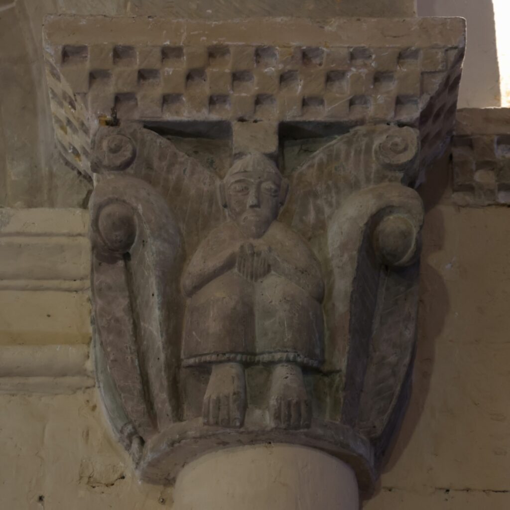 右(南)側の柱頭には、胸の前で両手をあわせて座る男性が彫られていると思います。