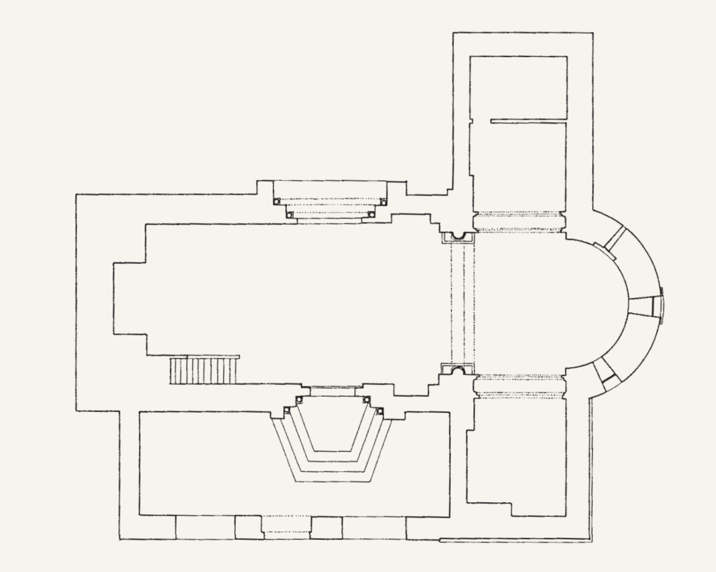 半円形後陣のアーチは18世紀に改築されたことをすでに指摘した。同じ時期に、内陣を覆うアーチも改築された。ロマネスク様式が残っているのは、勝利アーチと、高い台座の上に立つ半柱だけである。