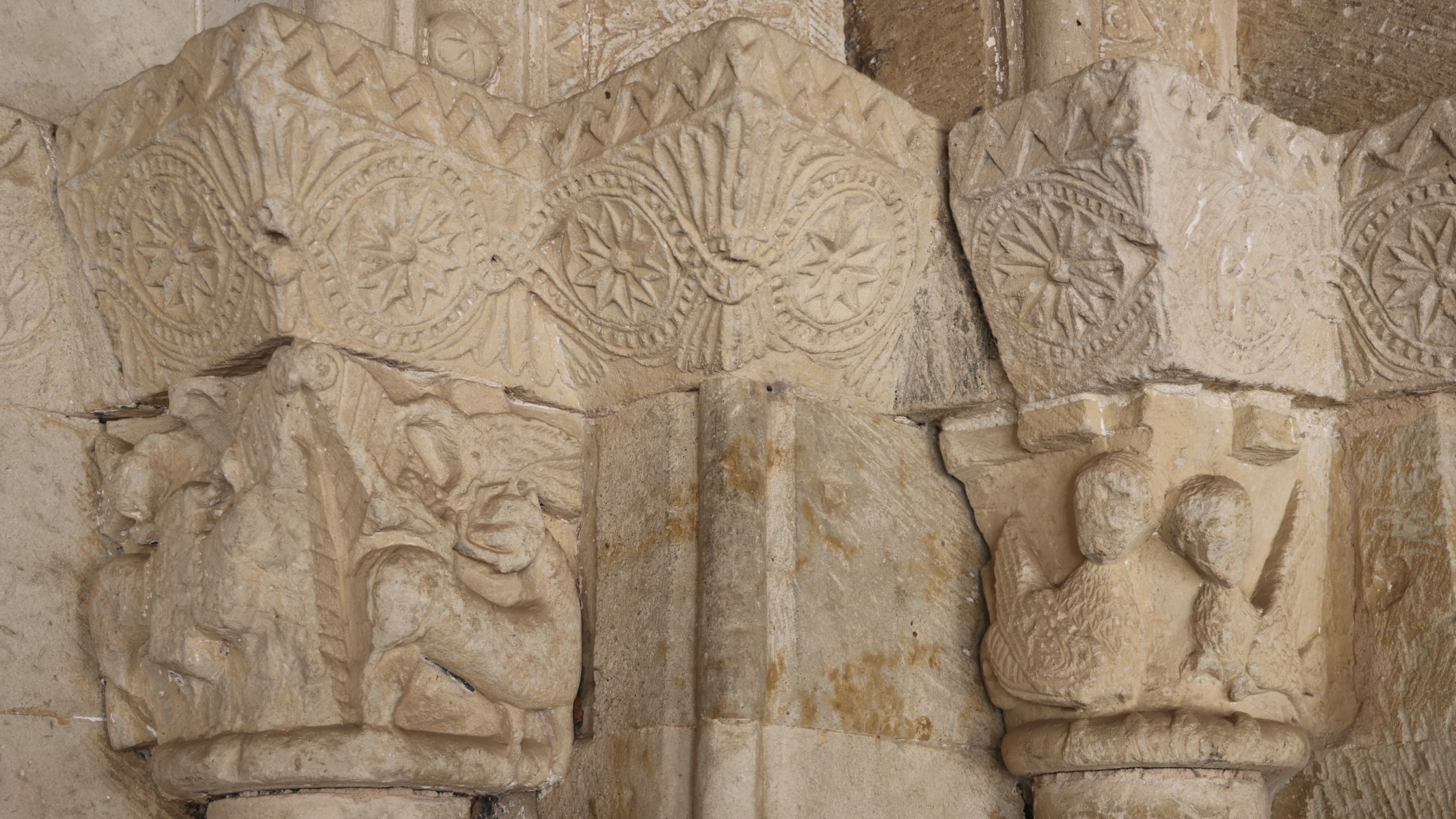 右(西)側の柱頭は、内側に様式化された植物、外側に2人の女性が彫られています。