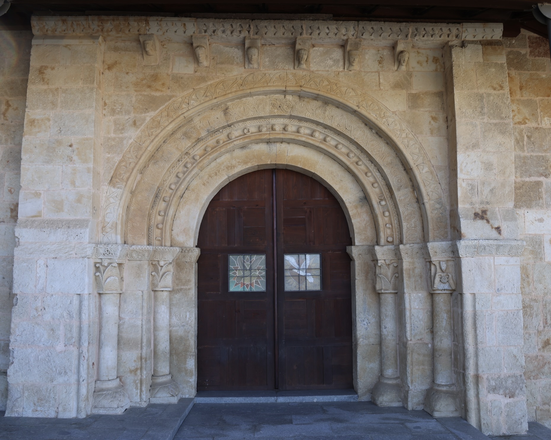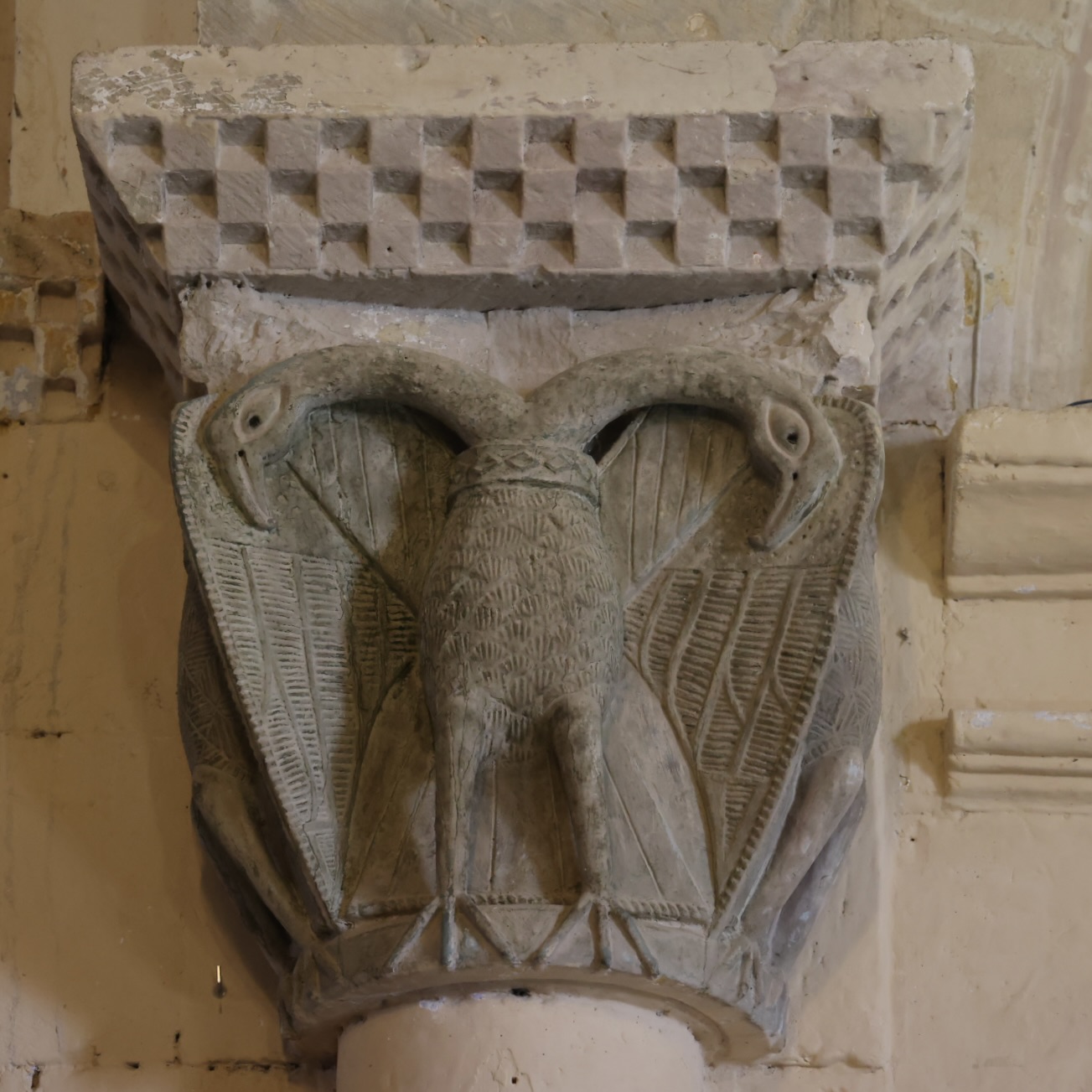 左(北)側の柱頭には、翼を広げた双頭の鷲が3羽、彫られています。首輪がかっこいいです。