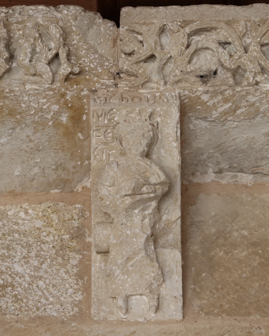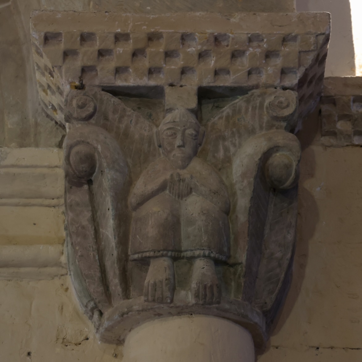 右(南)側の柱頭には、胸の前で両手をあわせて座る男性が彫られていると思います。