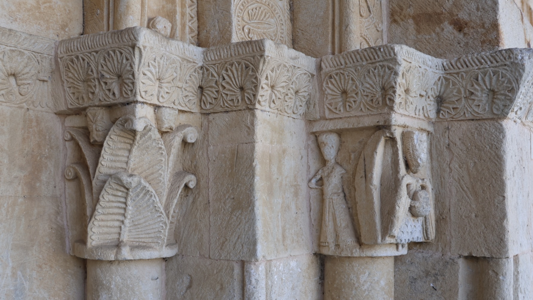 男性の両側(柱頭の東面と西面)には2人の男性が彫られています。
