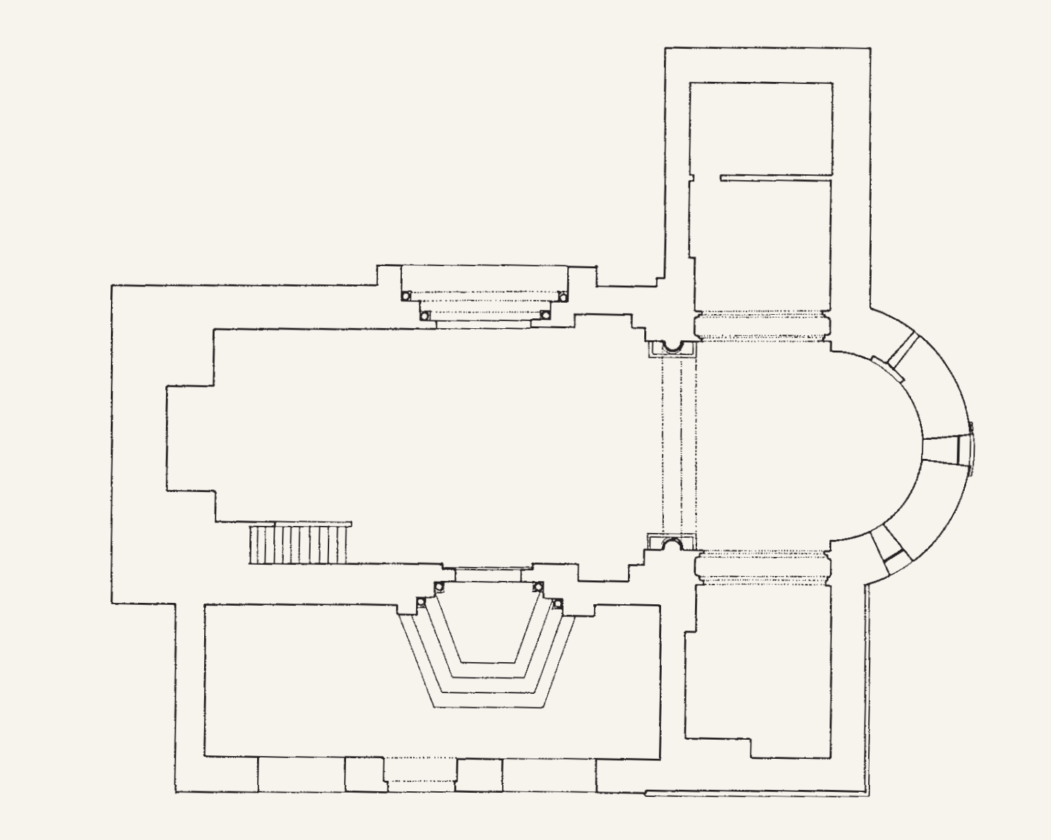元の構造から残ったのは半円形の形状と、2本の帯状装飾だけである。