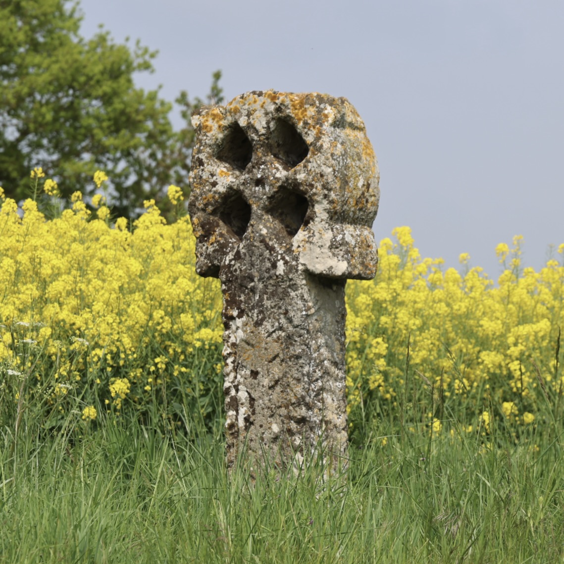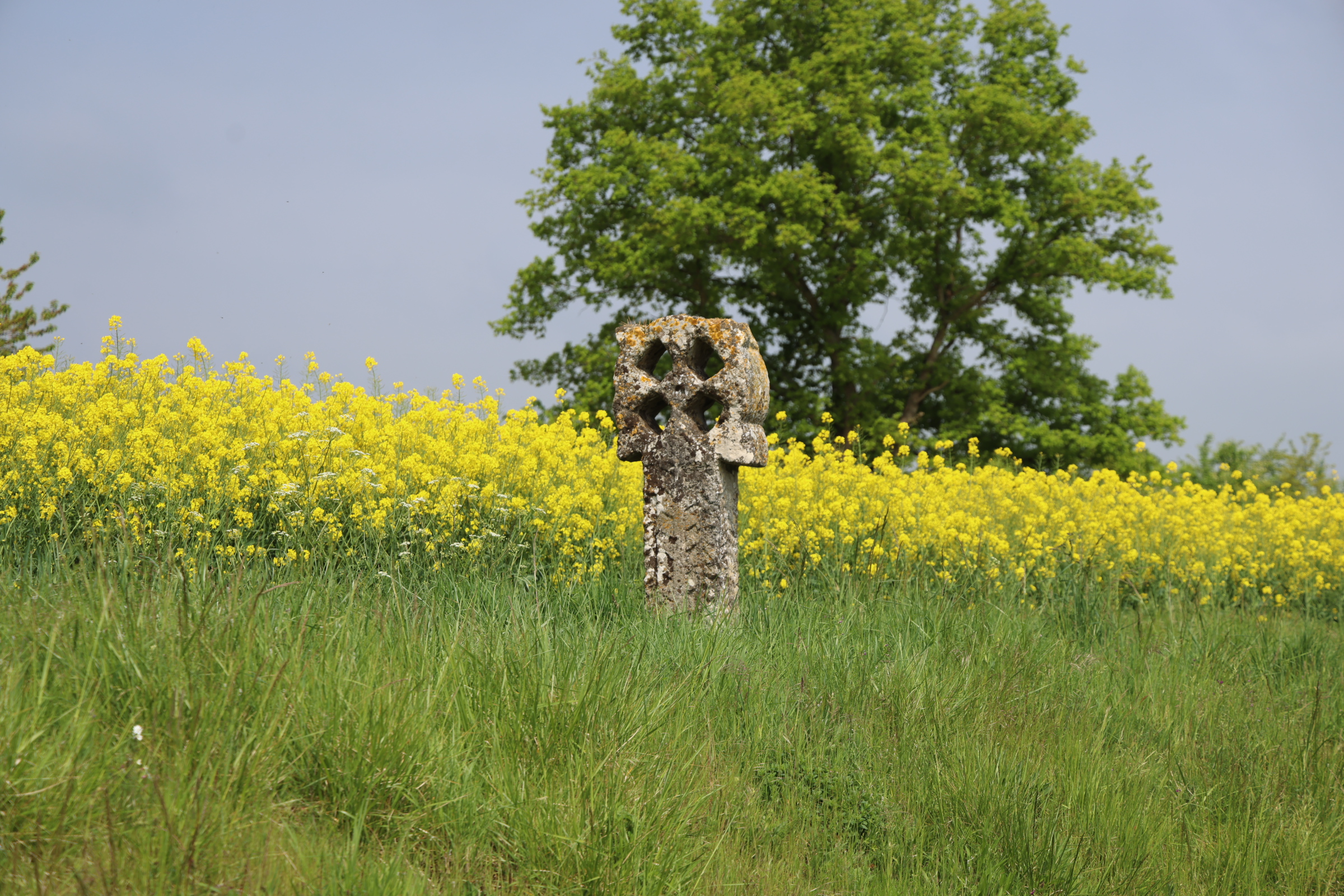 Croix romane。道端の野原に、オート=ノルマンディー地方で最も美しいロマネスク様式の十字架が立っています。