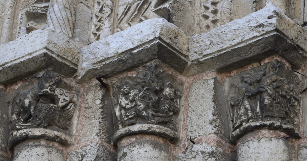 アーキヴォルトを支える柱頭には、物語性のある場面が彫られています。