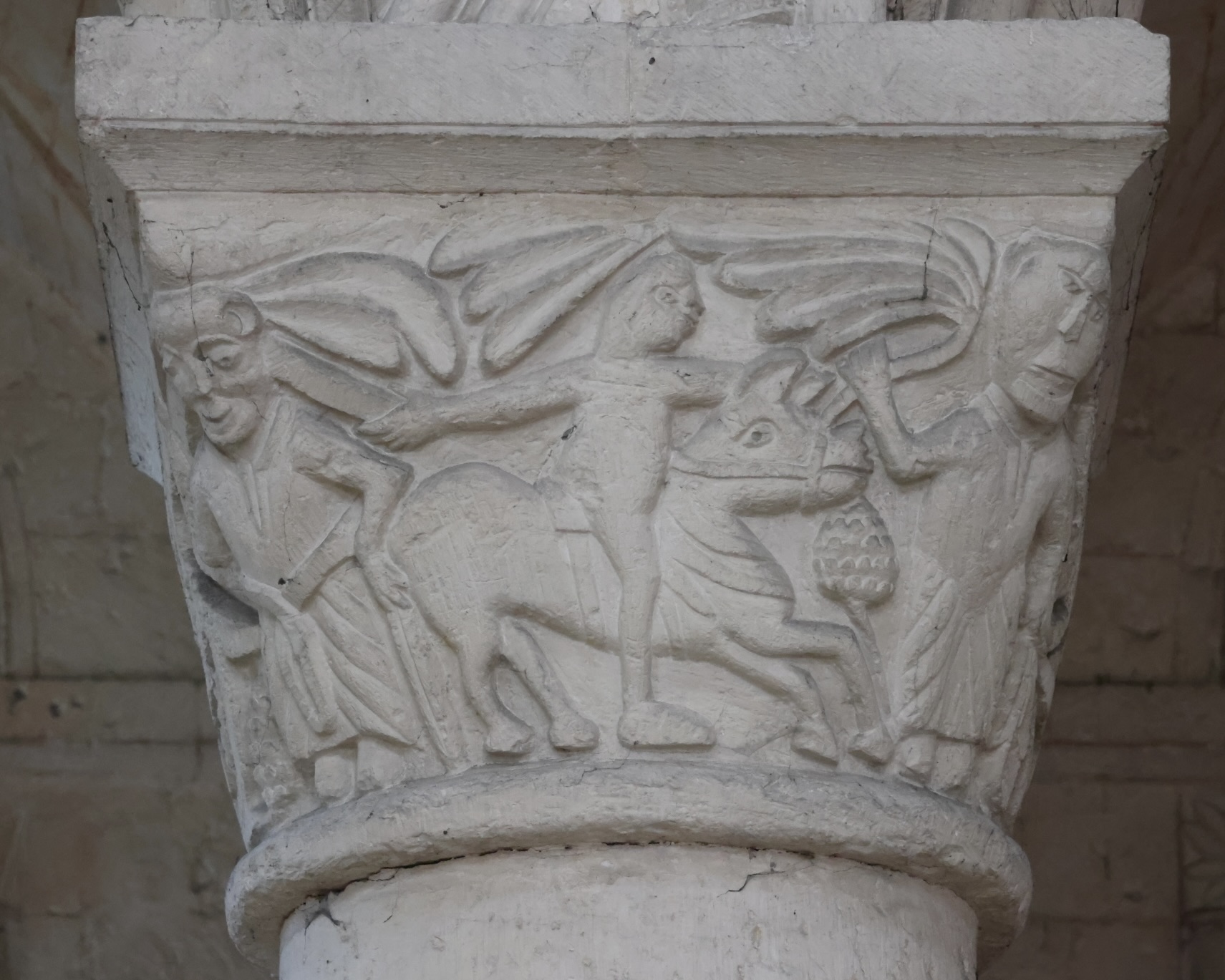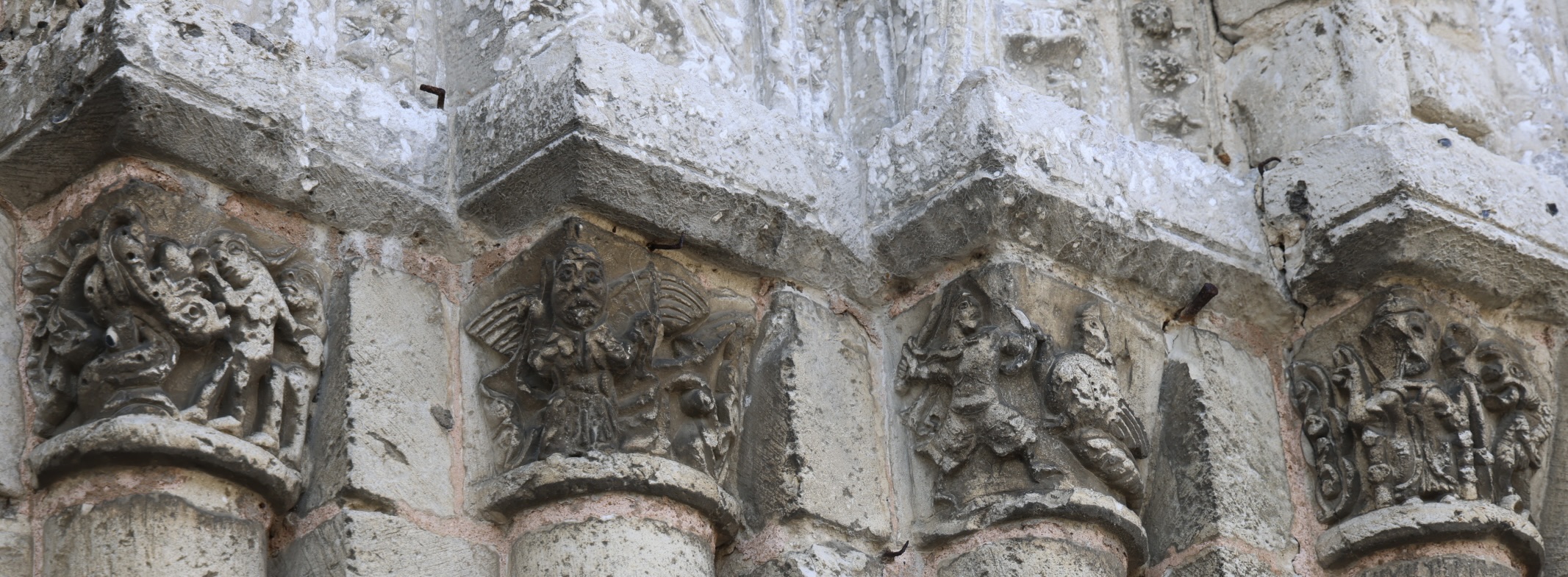 アーキヴォルトを支える柱頭には、物語性のある場面が彫られています。