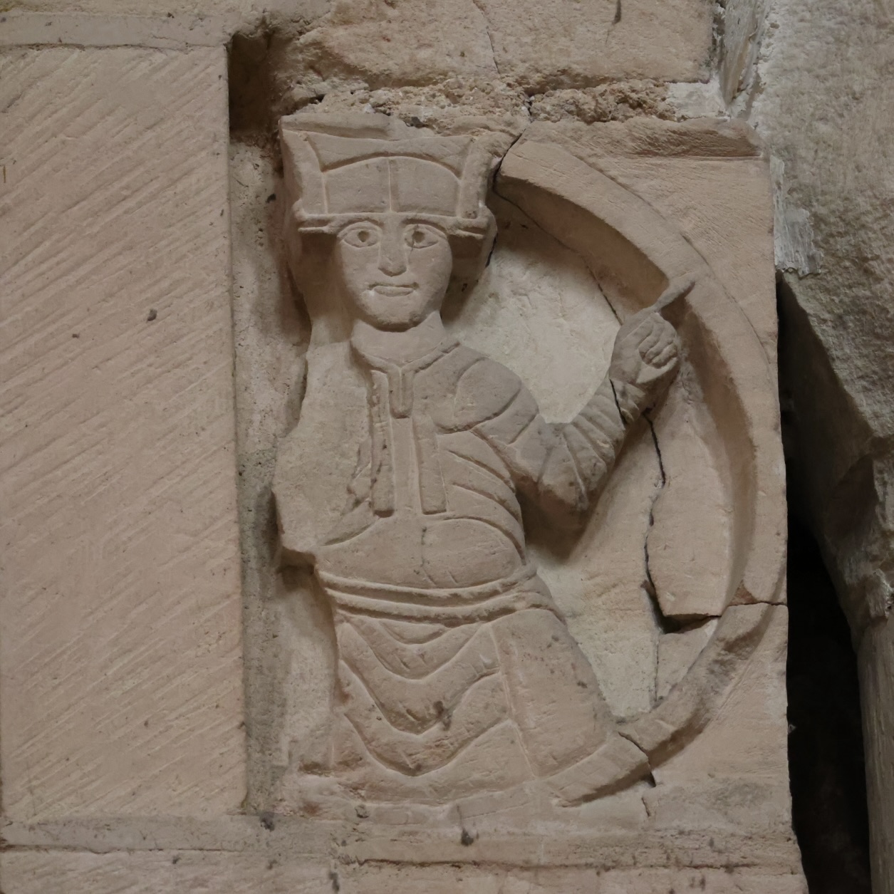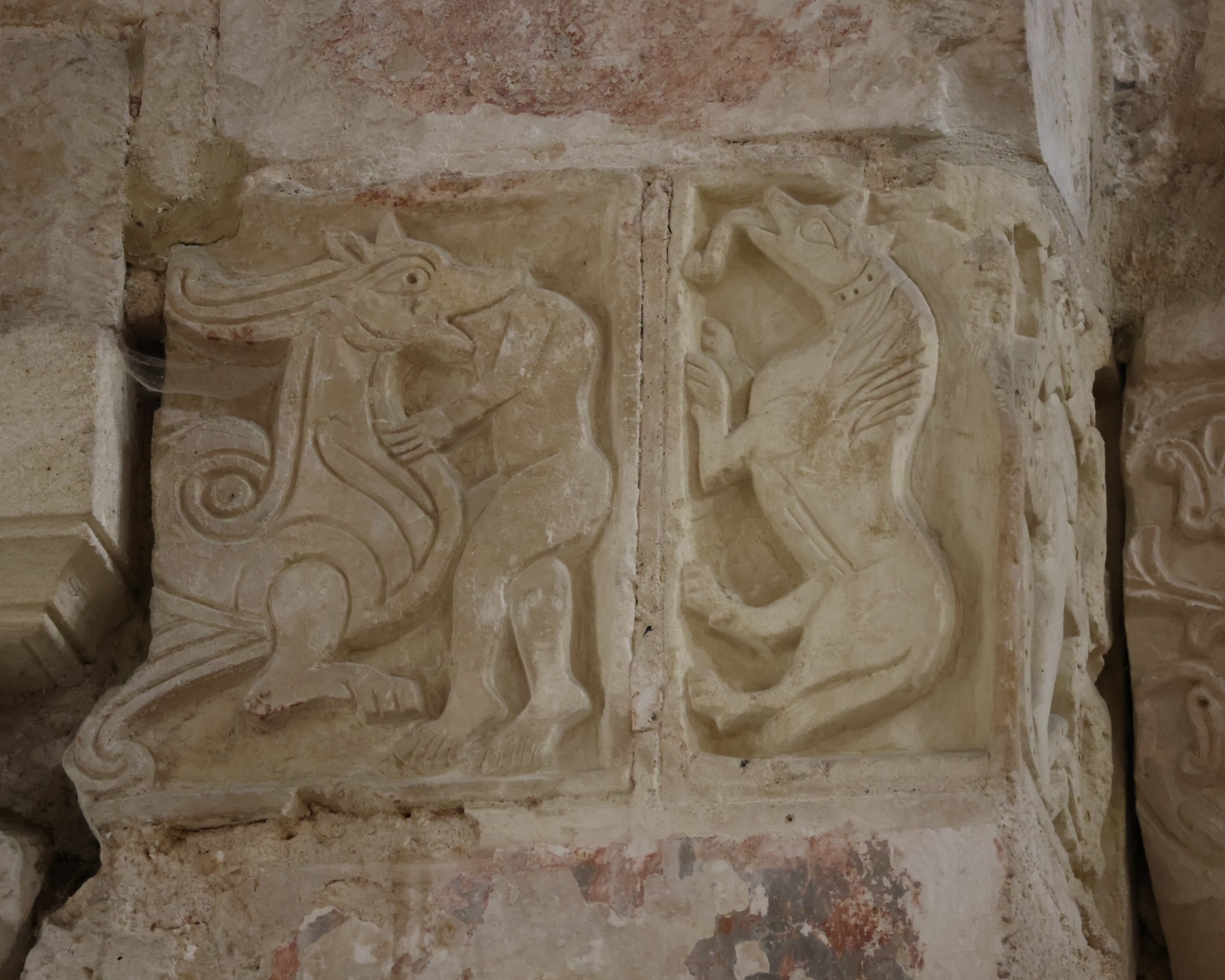翼廊では、残念ながら不完全な彫刻のフリーズが、修復された小後陣の柱頭の高さで、東側の壁に沿って走っている。これは、おそらく修道院教会が経験した火災や改修の過程で失われた、より豪華な装飾があったことを示唆している。
