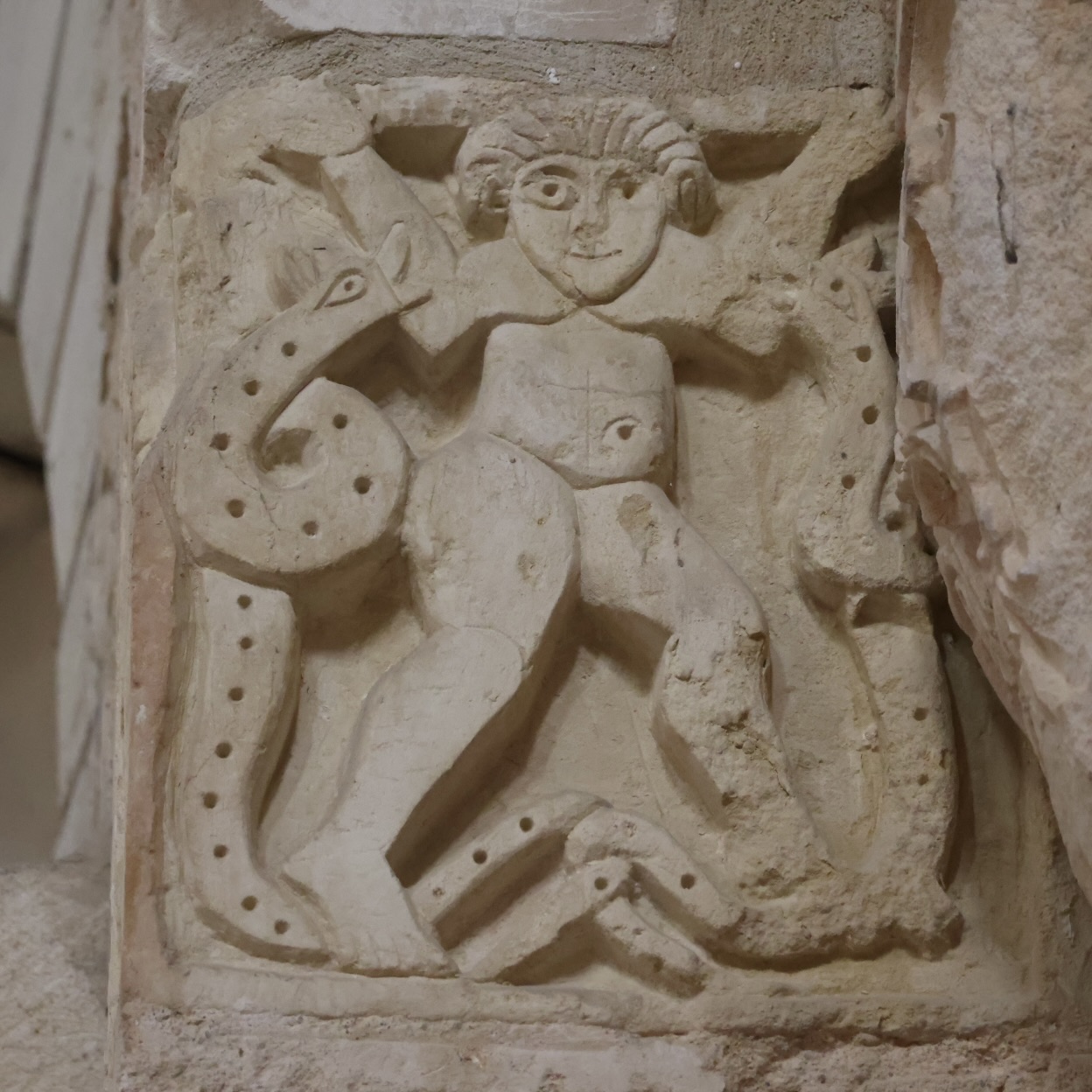 こちらでは、角のスクロール(渦巻き模様)部分が、人物の頭をかじる2体の怪物になっています。