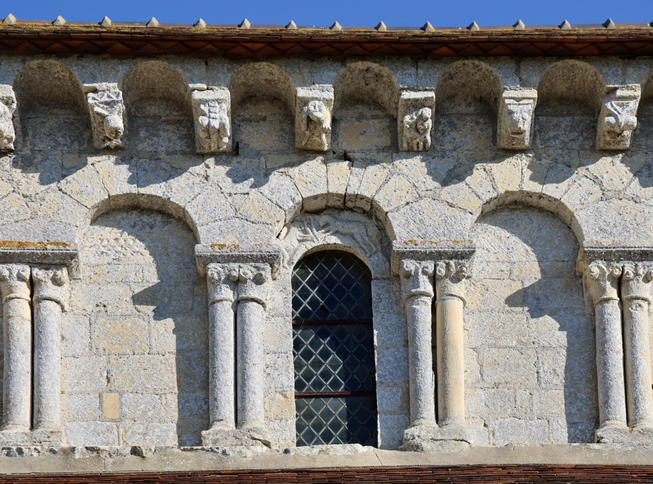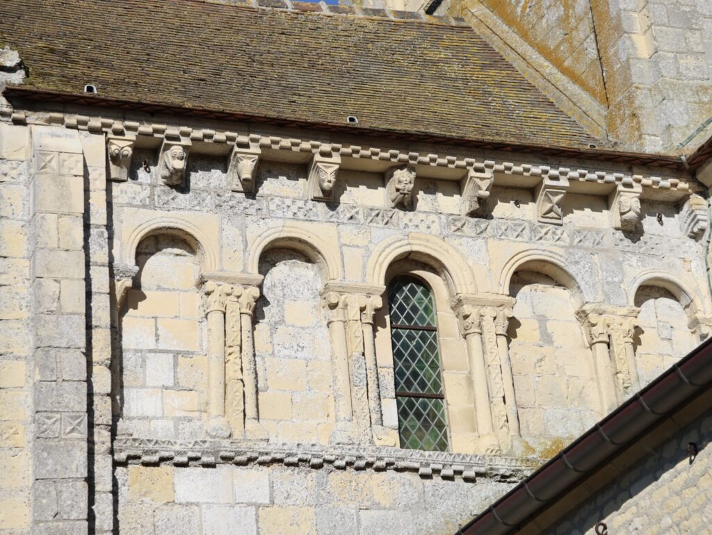 身廊には、軒下に彫刻された持ち送りがあり、その下に盲アーチが並んでいます。