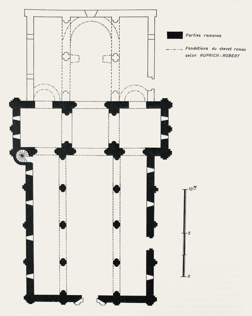 19世紀の研究者たちは、現在の建物の中で、火災以前に建てられた部分があるかどうかを特定しようとした。塔内で発見された、かなり不確かな痕跡に基づいて、彼らは一般的に、身廊、交差部と翼廊、そしてランタン塔が、この事件以前に建てられたものだと考えた。しかし、我々はそう確信していない。1105年以前に建てられたのは身廊だけであり、現在の塔は交差部と同様、ヘンリー1世碩学王のノルマンディー統治時代(1106年〜1135年)に再建されたものかもしれない。