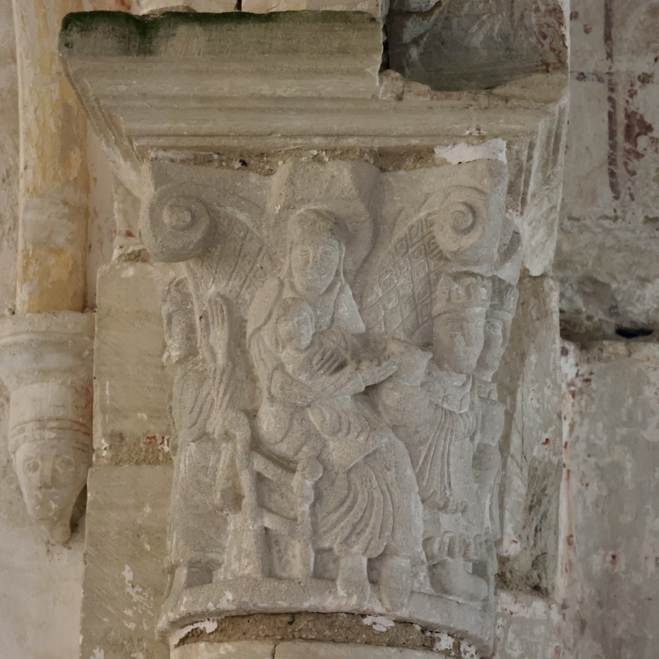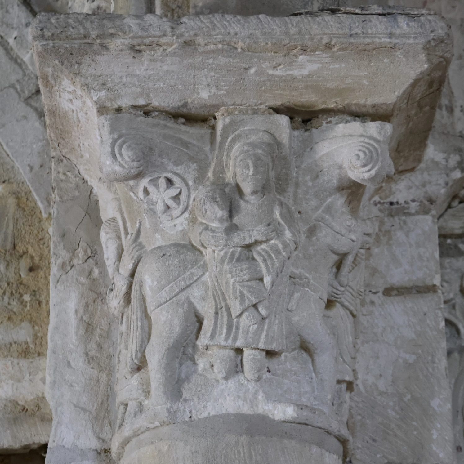 A エジプトへの逃避。柱頭の中央には、聖母マリアが膝の上に幼子イエスを抱いている。聖ヨセフが、大工の斧を持ってロバを引いている。左側には、道しるべとなる星を指し示す天使がいる。