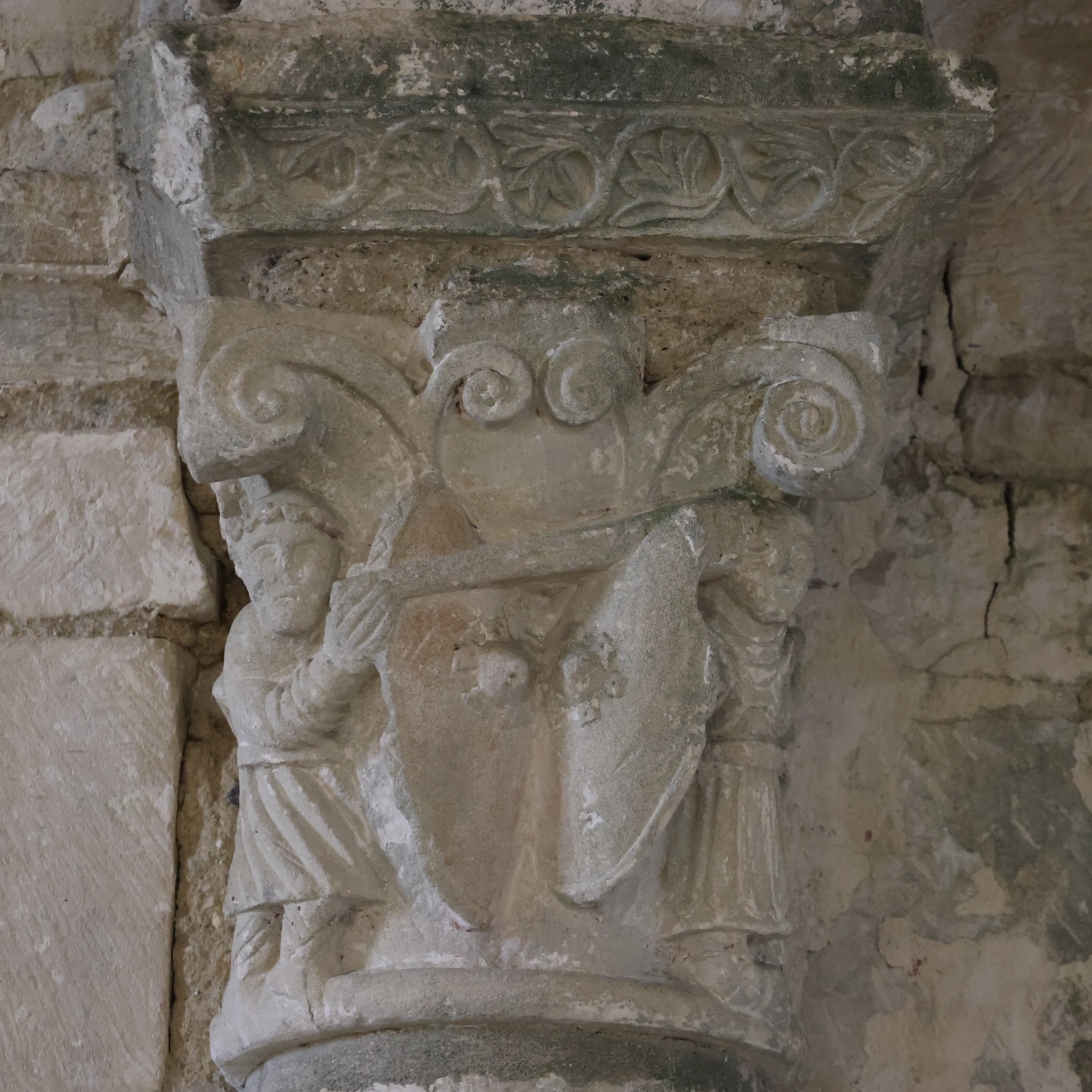 B 葉飾りで豪華に装飾された、上部のアバクスに注目しよう。善と悪の闘争を象徴して、2人の武装した男が巨大な盾をぶつけ合って対峙している。