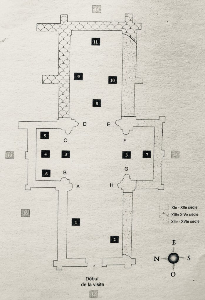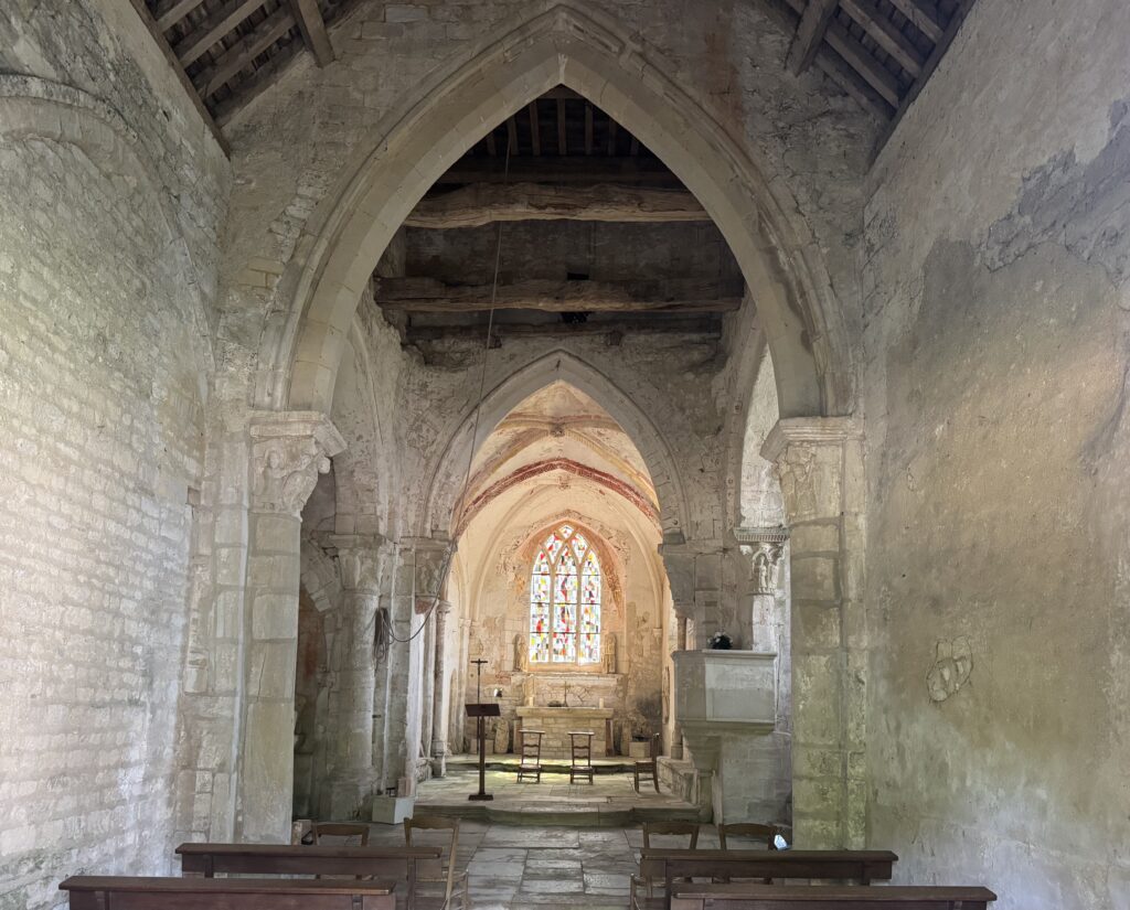 二つの半円アーチが、建物の中で最も古い部分である翼廊に面している。身廊とクワイヤをつなぐアーチは、破風型になっている。翼廊の4本の柱を覆う柱頭は、この地域では唯一のものである。アンジュー、フランス中部、南西部、スペイン北部の工房との類似点が見出されている。