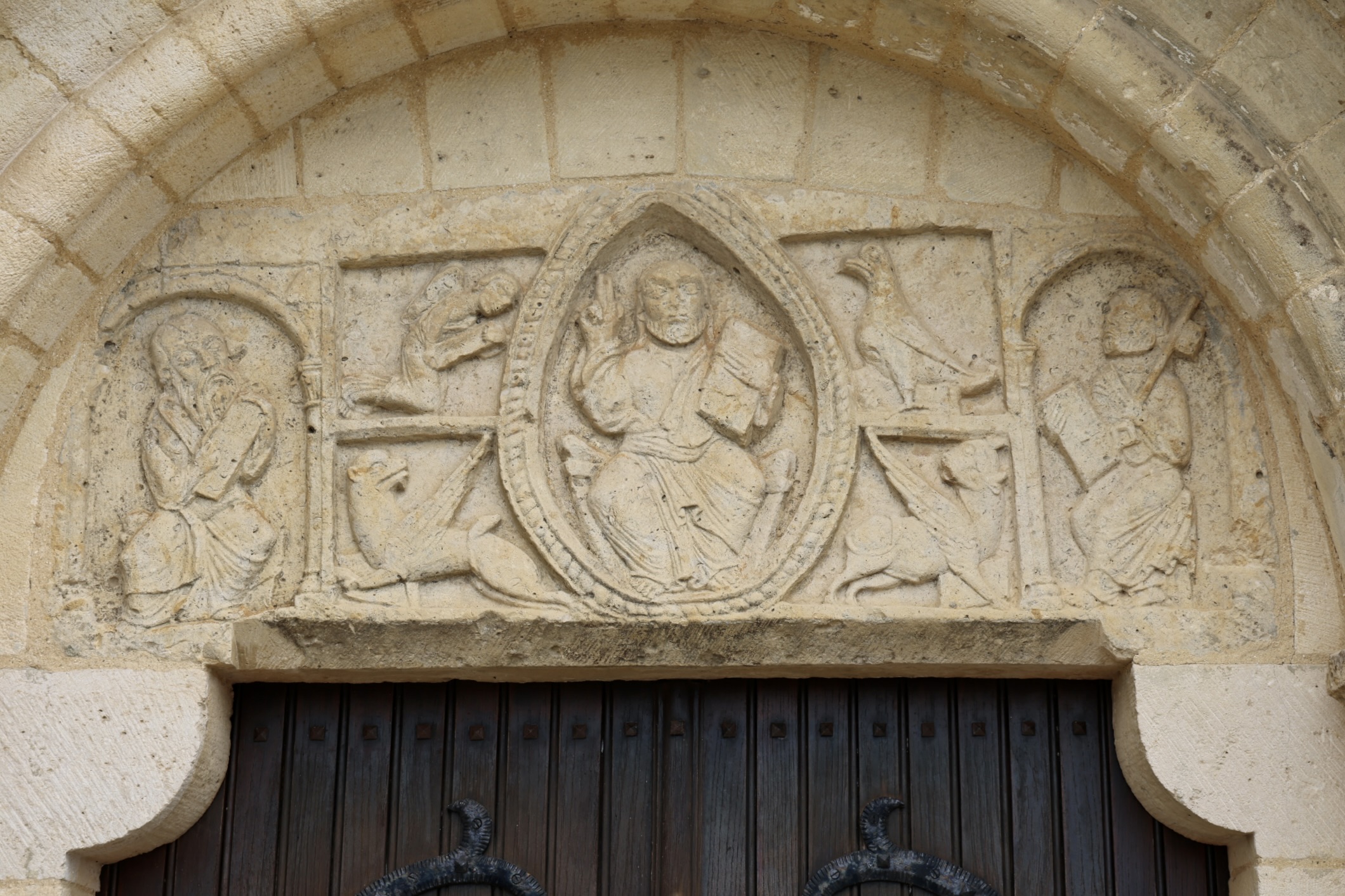 中央には、卵形のマンドルラの中に、威厳のあるキリストが座り、右手で祝福し、もう一方の手で本を持っています。その両側には、四福音書記者の象徴が彫られています。