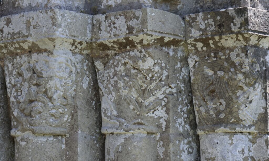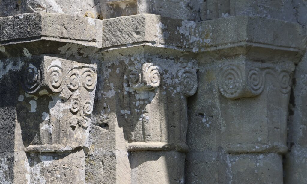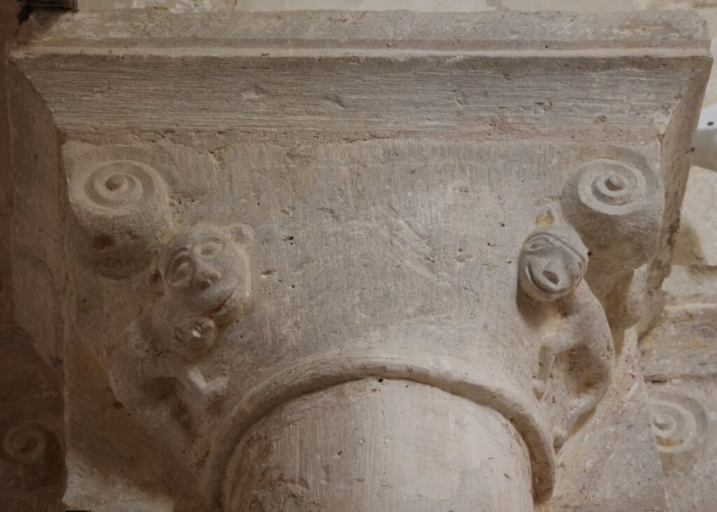 左側の柱頭は極めて簡素なデザインで、隅に螺旋模様がある。右側の柱頭はより装飾的で、内側には絡み合う蔦、中央には木の葉を食むリスが座り、外側には植物の装飾が施されている。